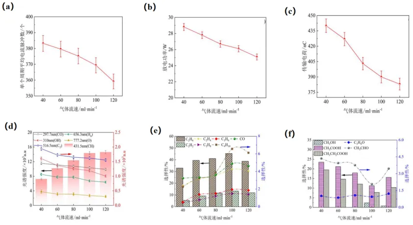 图3.(a)不同气体体积流量下单个周期平均电流脉冲数对比;(b)不同气体体积流量下放电功率对比;(c)不同气体体积流量下传输电荷量对比;(d)不同气体体积流量下活性粒子发射强度变化对比;(e)气态产物选择性随体积流量变化对比;(f)不同气体流速下液态产物选择性对比