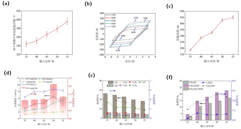 图4 (a)不同输入功率下单个周期平均电流脉冲对比;(b)不同输入功率下 Lissajous 图形对比;(c)不同输入功率下传输电荷量对比;(d)不同输入功率下各粒子光谱信号强度对比;(e)气态产物选择性随输入功率变化对比;(f)不同输入功率下液态产物选择性对比