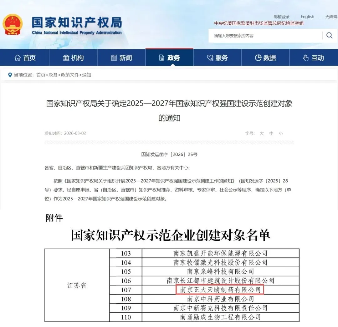 南京正大天晴始终将知识产权视为企业发展的核心战略。近年来,公司已逐步构建起覆盖“创造—运用—保护—管理”全链条的知识产权工作体系,多项专利技术成功应用于药物研发各个环节,有力支撑了企业的高质量发展。