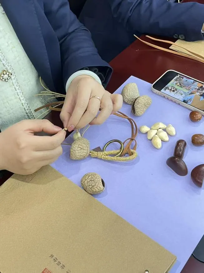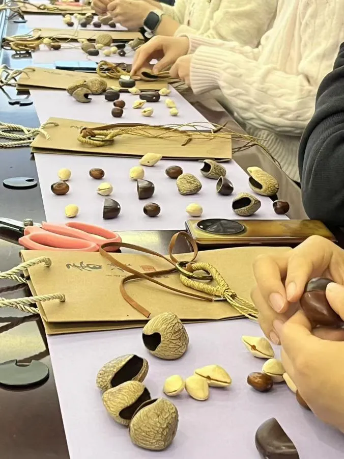 活动现场布置温馨雅致,空气中弥漫着植物的自然清香。参与活动的员工们围坐一堂,认真聆听指导老师讲解植物果壳风铃的制作方法与音疗理念。随后,大家挑选自己喜爱的天然果壳、植物种子、彩绳等材料,穿绳、搭配、装饰,一步步将质朴的自然原料,制作成独具匠心的音疗挂饰。轻轻摇晃,清脆悦耳的声响此起彼伏,既具装饰美感,又有舒缓身心的疗愈效果。大家相互交流、彼此欣赏,在轻松治愈的氛围中放松心情、增进情谊,现场洋溢着欢声笑语。