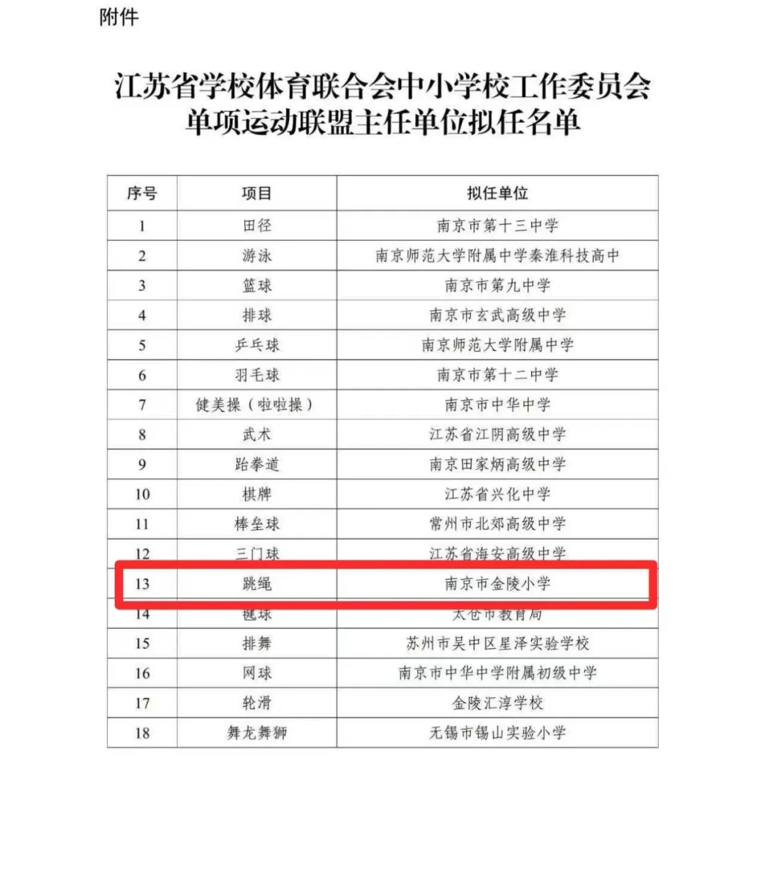 江苏省学校体育联合会中小学校单项运动联盟名单正式公布,南京市金陵小学凭借深厚的项目基础与突出的办学成果,成功当选跳绳运动联盟主任单位,将牵头推动全省中小学跳绳运动的普及与升级。 作为全国科技体育特色学校、南京市阳光体育先进学校,金陵小学深耕跳绳项目多年,实现9621名学生“生生会跳绳”的100%普及率,校队在省、市各级赛事中屡获一等奖佳绩。学校不仅拥有完善的运动场地与“老中青梯队化”骨干教师团队,更承办了长三角跳绳锦标赛、江苏省中小学生跳绳毽球锦标赛等多项重要赛事,积累了丰富的组织经验。