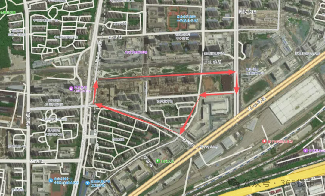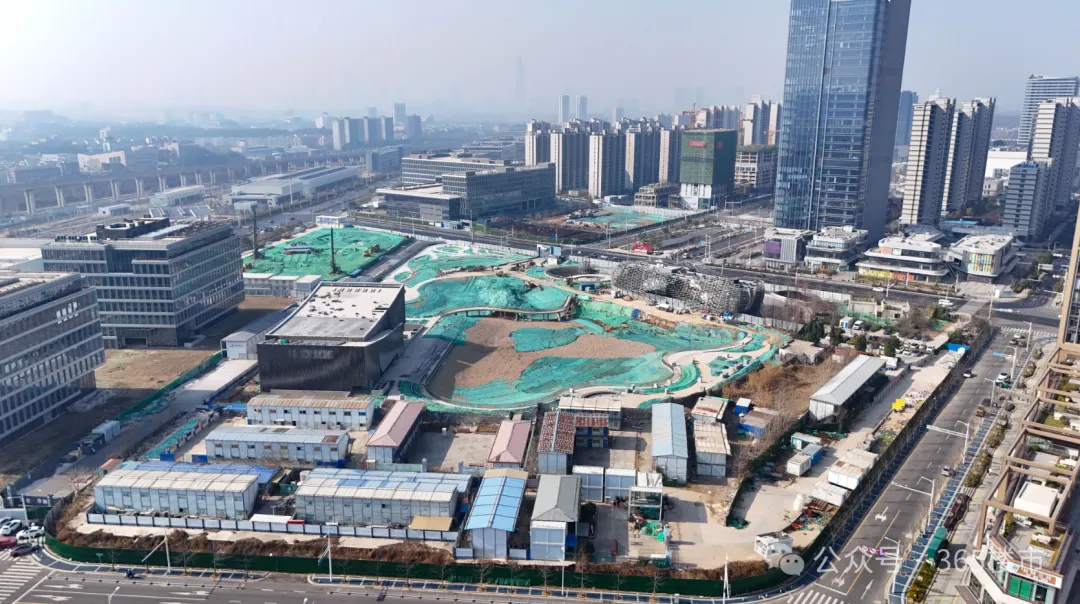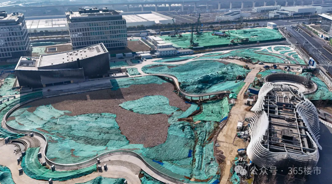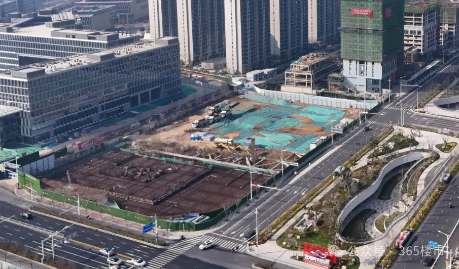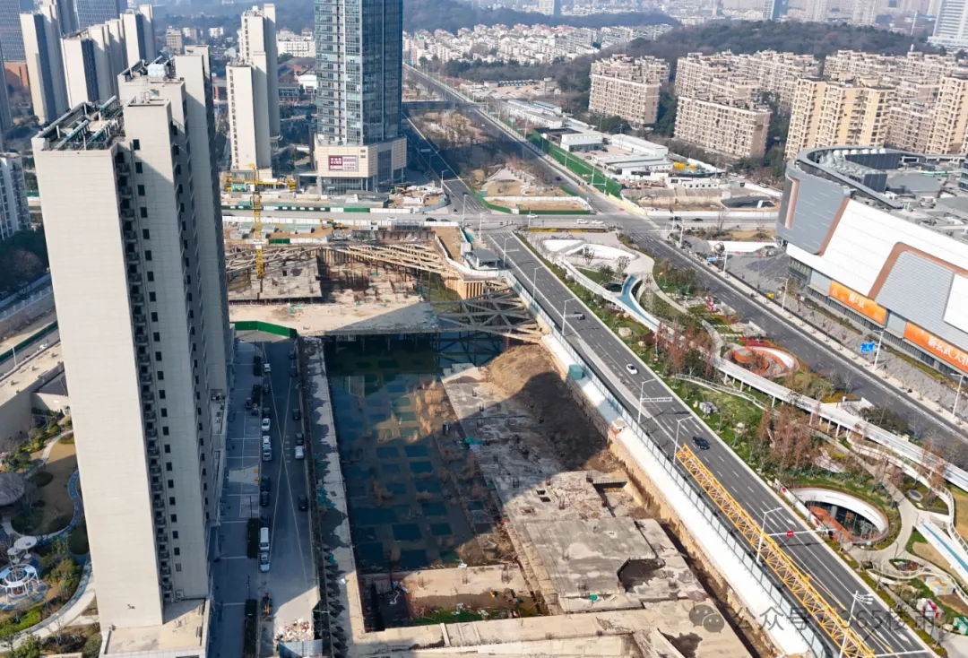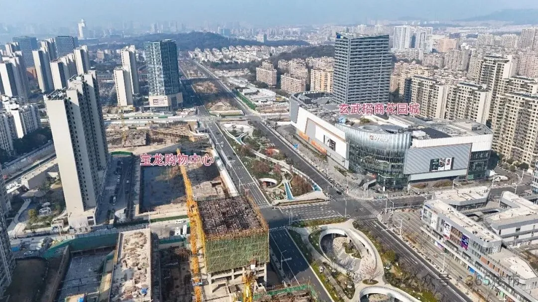 玄武宝龙城效果图从航拍图中可以发现,整个项目占地面积较大,体量非凡。目前项目的公寓楼部分建设进展较快,部分楼栋建筑高度已与住宅齐平,接近封顶。公寓部分是在2025年11月左右率先复工,这从侧面也可以看出来,项目是在不断推进中的。在公寓楼上还能看到“紫金山旁,玄武湖畔,213㎡大平层”的宣传标语。与之相对比,项目的购物中心以及甲级办公楼、城市展馆进展较慢。空中视角俯瞰,购物中心仍处于地下施工阶段,基坑中还有不少积水存在。宝龙购物中心工地与一路之隔的玄武招商花园城形成了鲜明对比,要知道玄武招商花园城地块拿地时间还比玄武宝龙城要晚1年。