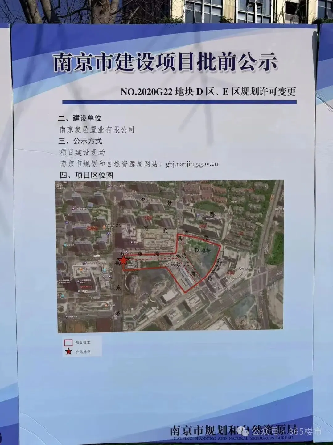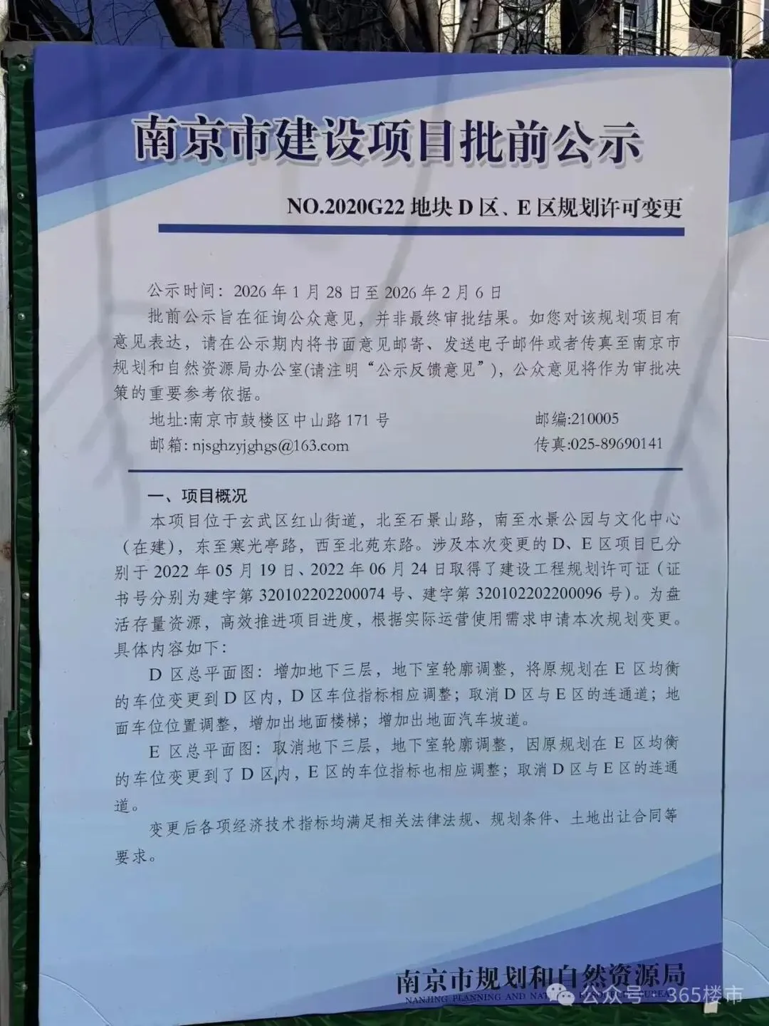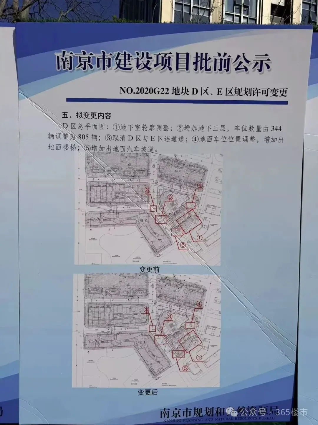根据前期规划,项目商业包含建面约8万方的自持MALL和建面约2.8万方的主题商业街,商业体量近11万方,其中约8万㎡的MALL将由宝龙统一招商、规划、运营和服务。从目前进展来看,购物中心距离开业还有一定的时间需要等待。从航拍中可以发现,城市展馆地块已经全部平整完毕,地块之上还有不少施工车辆。办公楼地块基坑施工已经基本完成,不过该地块处于这一状态已有一段时间,并没有什么实质性的推动。整体来看,目前玄武宝龙城除了已经交付的住宅外,公寓、商场、办公、城市展馆均未建成,其中公寓部分进展稍快一些,并且已经复工。从官方回复来看,项目仍然在推进中,尤其是购物中心,代建单位正在洽谈中,确定会复工。值得注意的是,就在去年年底,江宁宝龙城正式开业,作为宝龙在南京主城打造的首个商业综合体,该项目的开业也为玄武宝龙城注入信心,让我们拭目以待。在玄武宝龙城斜对过就是复地明日之城,值得注意的是,在项目围挡外张贴出了D区、E区地块的规划许可变更。根据信息显示,D区总平面图:增加地下三层,地下室轮廓调整,将原规划在E区均衡的车位变更到D区内,D区车位指标相应调整;取消D区与E区的连通道;地面车位位置调整,增加出地面楼梯;增加出地面汽车坡道。E区总平面图:取消地下三层,地下室轮廓调整,因原规划在E区均衡的车位变更到了D区内,E区的车位指标也相应调整;取消D区与E区的连通道。