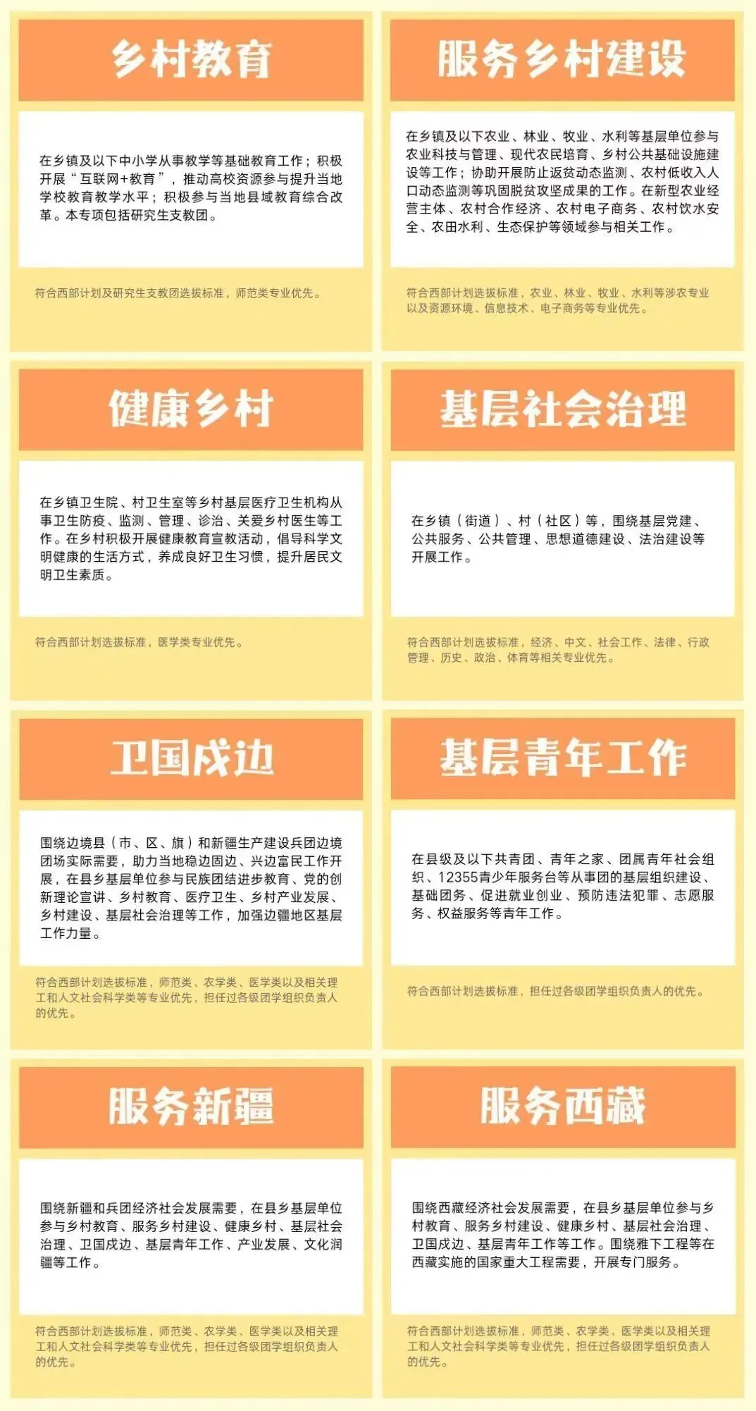 普通高等学校(教育部《全国普通高校名单》所列高校)应届毕业生或在读研究生,拥护中国共产党领导,热爱祖国、热爱人民、热爱社会主义,理想信念坚定,思想政治素质好,到岗之前获得毕业证书和学位证书,通过西部计划体检。有志愿服务经历的优先录用。✅服务内容