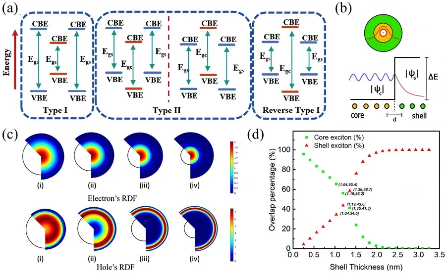 图1 核壳量子点的能带对齐类型及壳层厚度依赖的激子分布特性