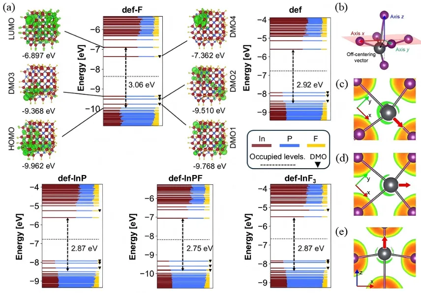 计算解析缺陷及结构影响发光机理(图2):通过双组分DFT与屏蔽单电子组态相互作用方法,从原子层面揭示了InP量子点表面缺陷对发光的调控机制。图2(a)展示了InP量子点的分子轨道能级与电子密度分布,明确三重配位P原子为空穴陷阱,三重配位In原子为电子陷阱。针对二维钙钛矿,图2(c~e)的电子定位函数等值线图显示,间隔阳离子引发的结构畸变会增强激子-声子耦合,提高非辐射复合损失。