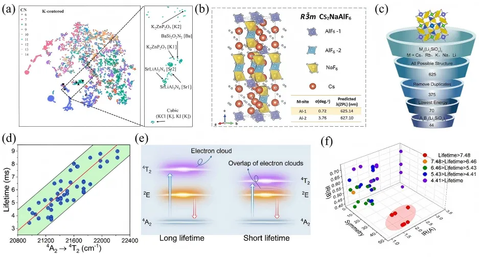 数据驱动发现新型荧光粉(图4):基于局部结构相似性思想,机器学习通过t-SNE技术将无机晶体结构数据库中数万种化合物的局部结构映射为二维散点图(图4(a))。以已知窄带荧光粉BaSi2O2N2:Eu2+的Ba位局部结构为参考,成功筛选并合成了新型窄带发射荧光粉K2ZnP2O7:Eu2+(半高宽30 nm)。针对Mn4+掺杂红色荧光粉的激发态寿命预测,随机森林模型揭示了B位对称性为关键结构特征(图4(d~f)),据此发现了(TMA)2SnF6:Mn4+和(TMA)2HfF6:Mn4+两种新型氟化物,其内量子效率>92%,基于前者组装的微型LED显示原型色域覆盖达124% NTSC。