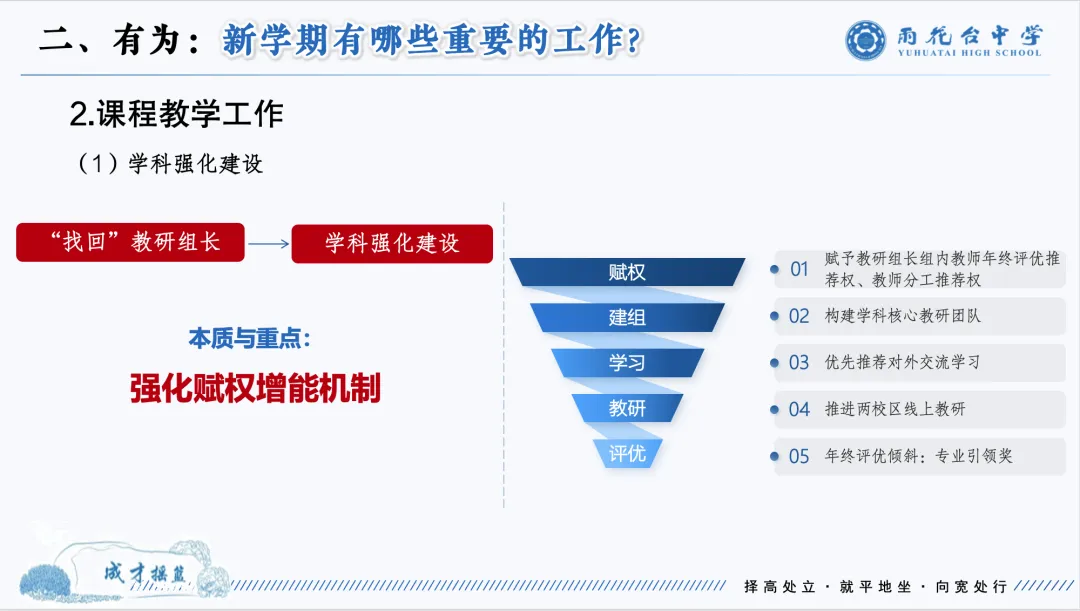 孙校长围绕党建工作、教学发展、教师培养、五育融合、校园建设等八大核心板块,部署了新学期具体工作任务,件件抓实处、事事有目标。其一,筑牢党建根基,将党建工作与教育教学深度融合;其二,聚焦教学核心,重点推进科学高中建设与招生工作,强化各学科建设,锚定高三备考核心目标,从建组、学习、教研、评优、赋权五大维度激发教师队伍活力,让教学管理更具实效;其三,强化教师培养,实施分类施策,对职初教师做好成长引领、专业赋能与实践指导,为全体教师搭建专业发展平台,通过教研交流、培训学习等方式提升教师综合素养,同时明确两校区骨干教师、学科带头人的评选预期目标,打造高素质教师队伍;其四,深化五育融合,以健康学校建设为引领,强化校园足球、篮球特色项目建设,丰富文体活动,切实落实学生身心健康工作,推动五育并举落地见效;其五,夯实校园发展,兼顾校园硬件建设与人文关怀,在完善校园设施的同时,提升教职工的归属感与幸福感。此外,孙校长还对学校的教研活动、学生培养、校园管理等工作作出了精细化安排,明确了各月份的核心活动计划,让各项工作有章可循、有序推进。
