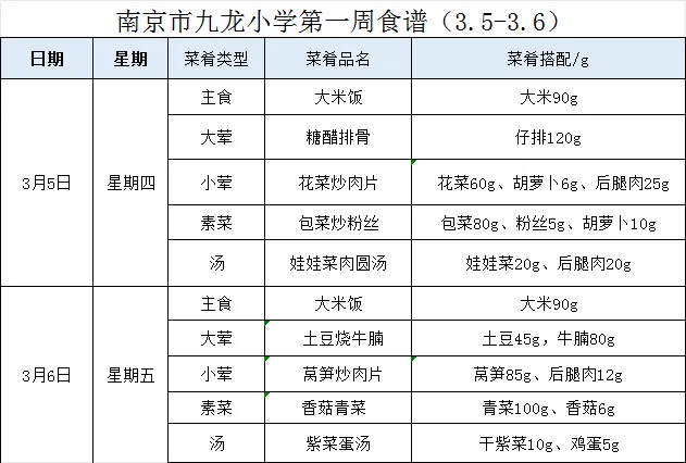 【龙园美食】南京市九龙小学午餐周菜谱(3.5-3.6)