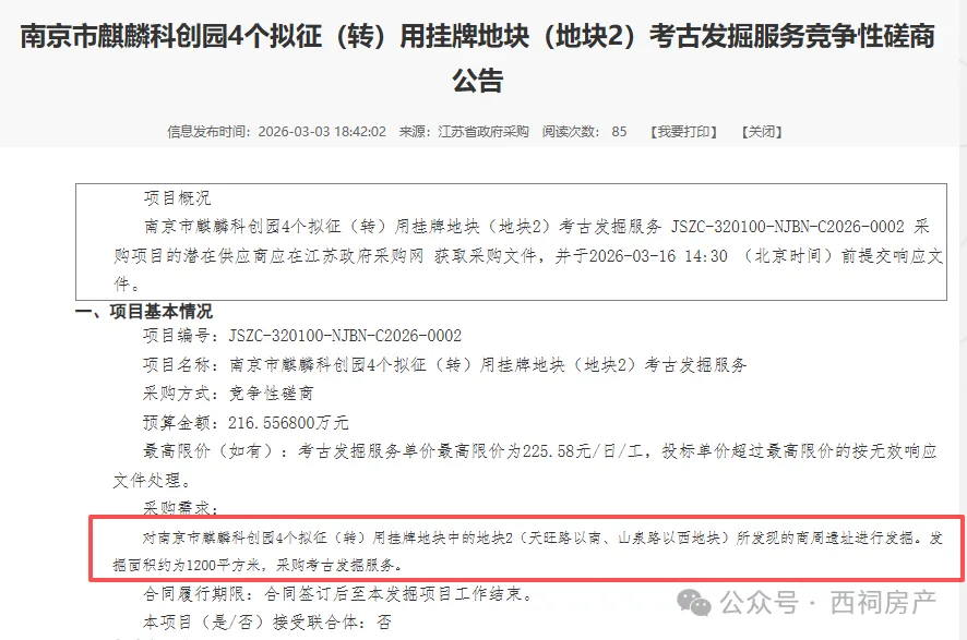 3月3日,南京市麒麟科创园4个拟征(转)用挂牌地块(地块2)考古发掘服务竞争性磋商公告发布。