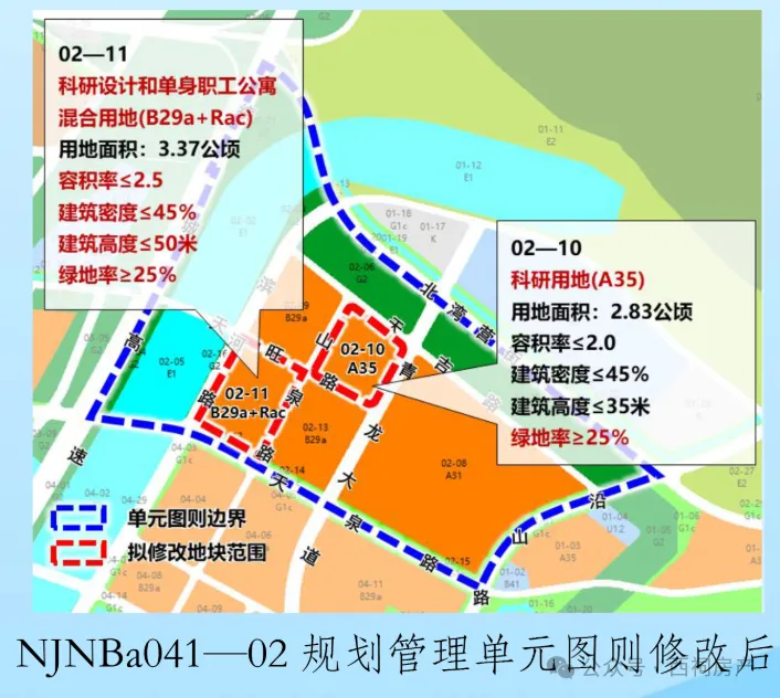 该地块由科研设计用地(B29a)调整为科研设计和单身职工公寓混合用地(B29a+Rac),容积率≤2.5,建筑密度≤45%,建筑高度≤50米,绿地率≥25%。