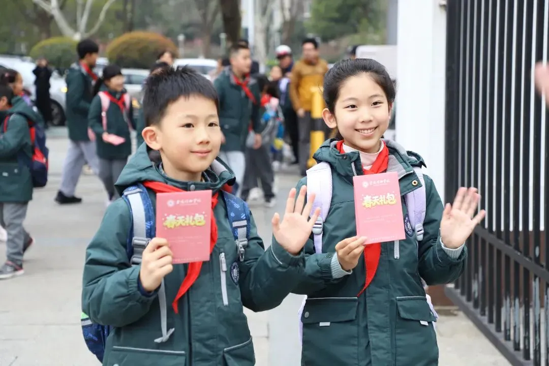 “送你一个春天!”清晨八点的金陵河西学校小学部,六年级的同学们化身“春日小使者”,送给低年级的小朋友一份充满绿意的礼物——一个装着植物种子和心愿卡的神秘礼包。