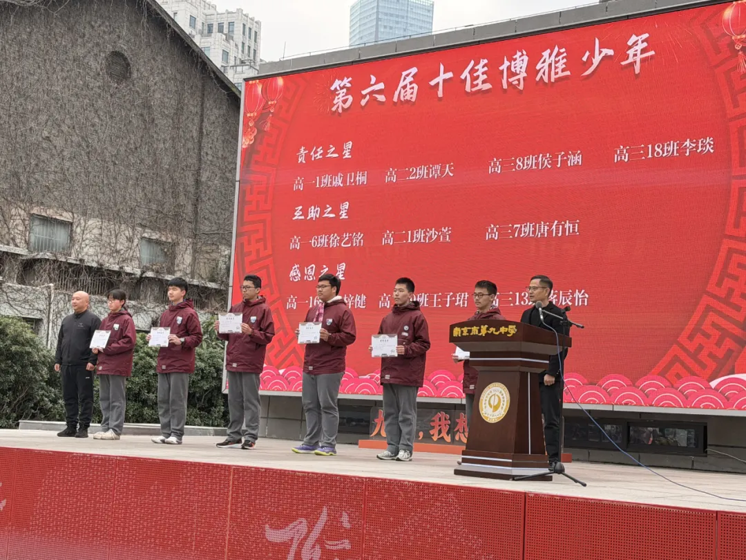 典礼上,一位身边的英雄获得全场掌声——高三学子王禹澄因在除夕夜勇敢冲入火场救援邻里而受到表彰。更酷的是,校园AI助手“豆包”闪亮登场,用智能语音揭晓了2025年度校园十大新闻,从勇夺冠军到喜获清华通知书,从百年校庆到艺术馆揭牌,每一件都是九中人的骄傲。