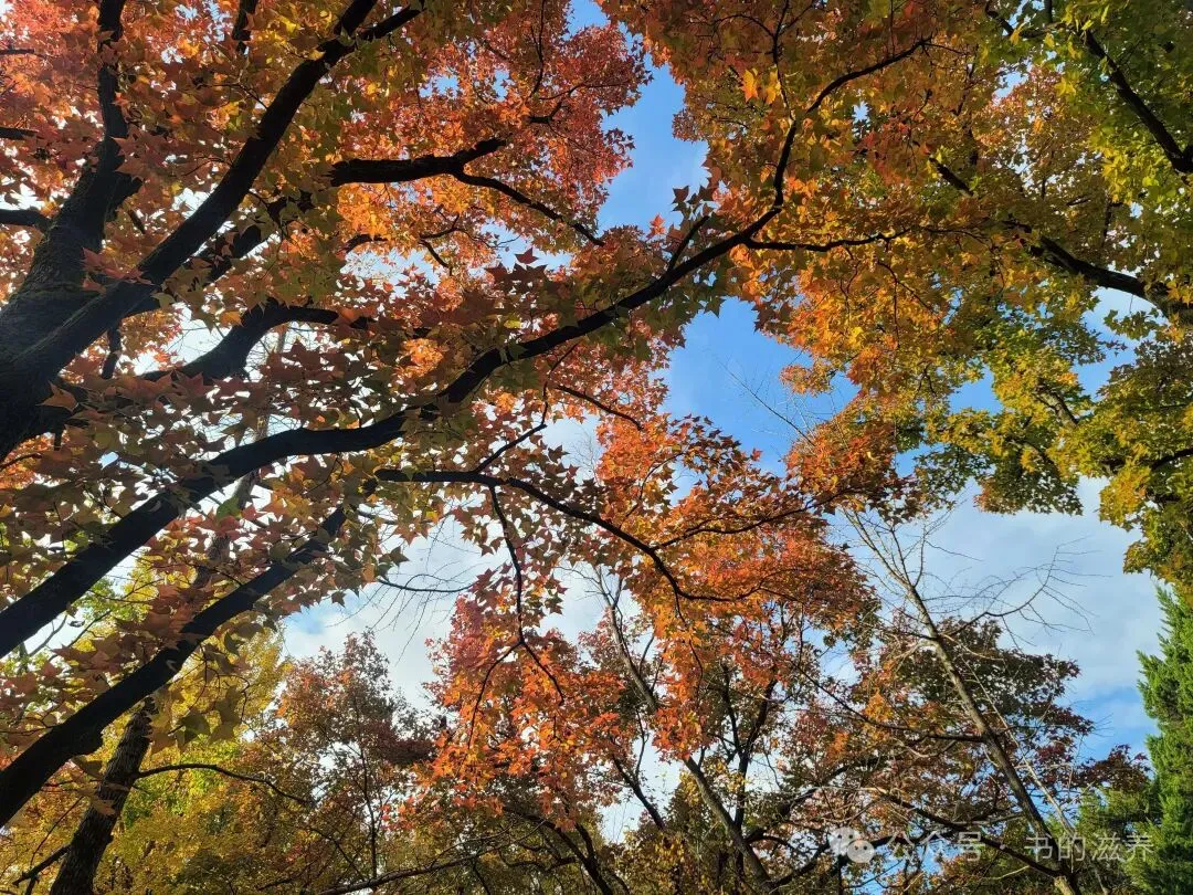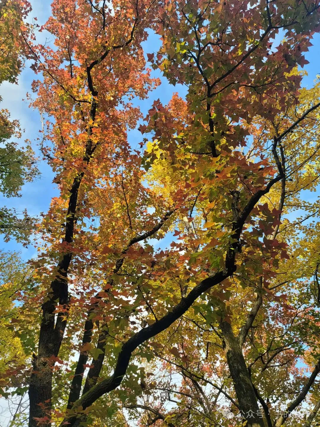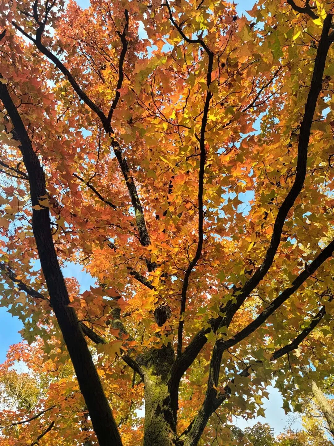 梧桐树有些叶子已经很红艳,在蓝天的映衬下格外耀眼。