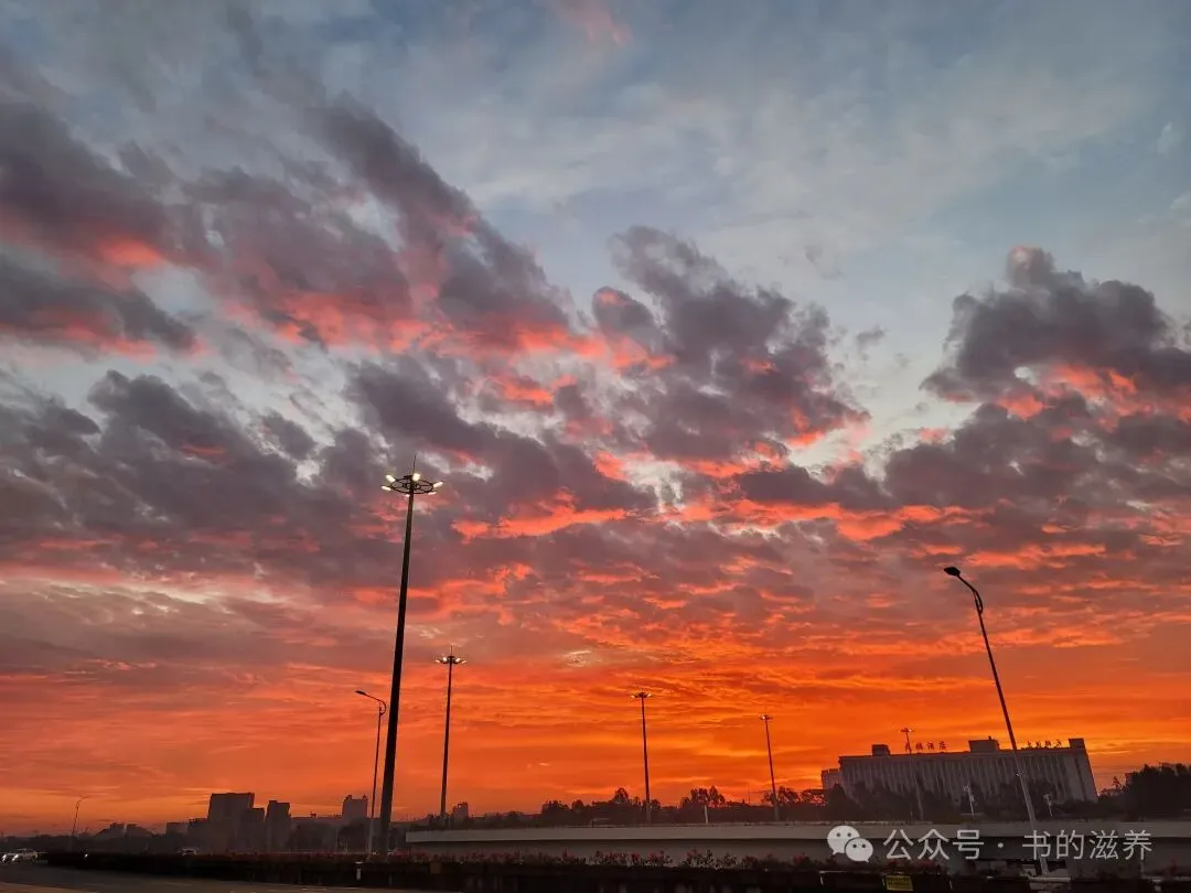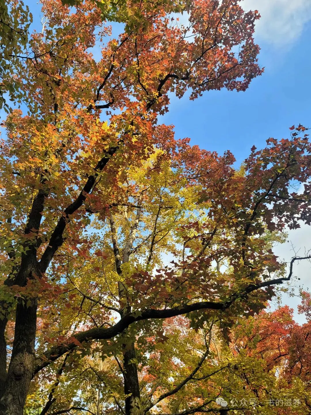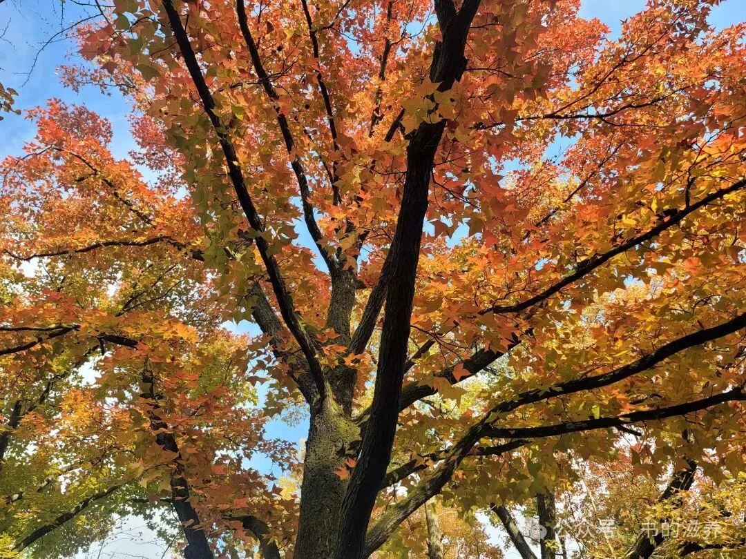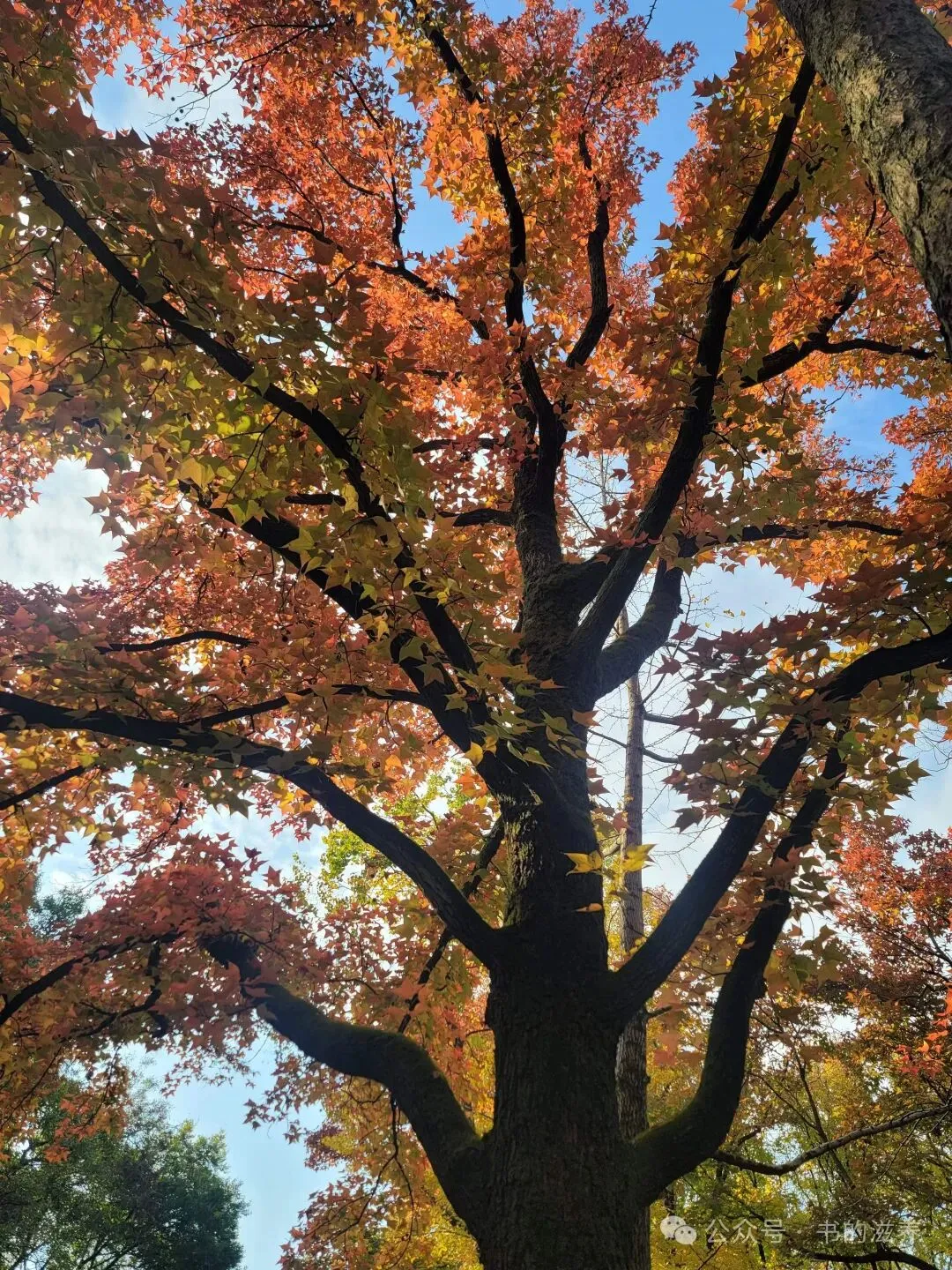 梧桐树有些叶子已经很红艳,在蓝天的映衬下格外耀眼。