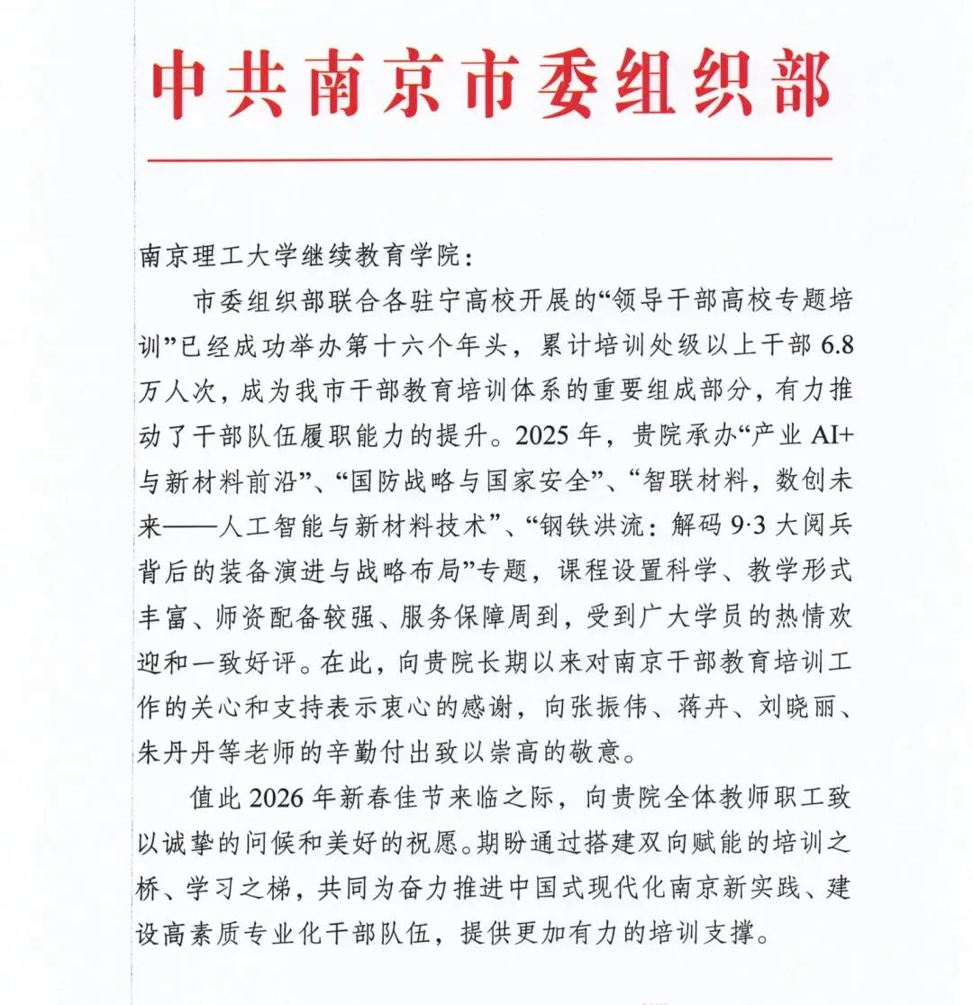 在假期期间,中共南京市委组织部干部教育处致函南京理工大学继续教育学院,对学院在南京市领导干部教育培训工作中所展现出的专业能力以及取得的扎实成效给予了高度评价,同时对学院为南京市领导干部教育培训事业作出的积极贡献予以充分认可。