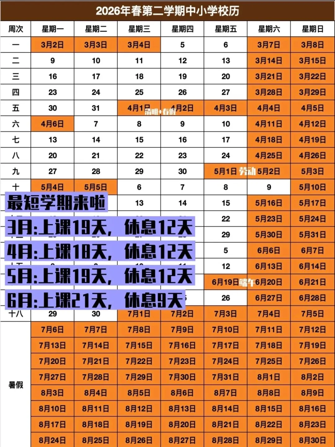 按照教学规划,春季学期总时长仅18周,再叠加春假、清明、五一、端午4个假期,实际教学天数不到80天。