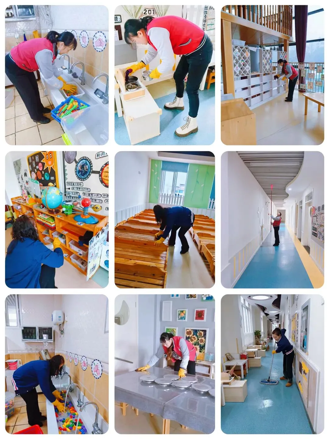 为迎接可爱的宝贝们归来,南京永恒幼儿园全体教职工整装待发,以匠心守初心,用细致筑安心,从环境消杀、卫生清洁、教研蓄力到安全排查,全方位做好开学准备,只为让每一个宝贝,都能在温馨、安全、充满生机的乐园里,开启一段崭新的成长旅程。为了给幼儿营造一个健康、舒适的学习与生活空间,老师们从 “心” 出发,以 “细” 为准则,严格遵循卫生消毒制度,对室内地面、墙面、门窗、卫生间、幼儿活动室等进行了全方位无死角的清洁消毒,对班级设施设备、玩教具、图书等进行了仔细地消毒、擦拭、晾晒,确保班级环境安全无忧。