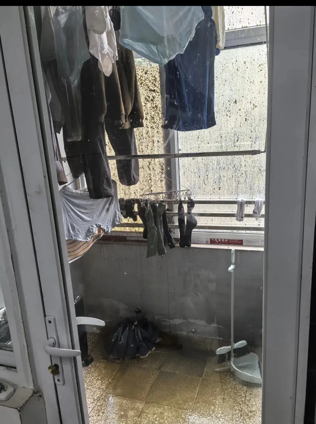 里面也是惨不忍睹,打开着通风的窗户,估计后悔死了。阳台晾晒的衣服也全被殃及,这也不用洗了,估计都得扔。
