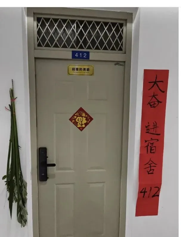 更有学生宿舍门口的楹联,大奋,进宿舍。不知道是之前写的,还是纯粹为了打趣这次的情况。