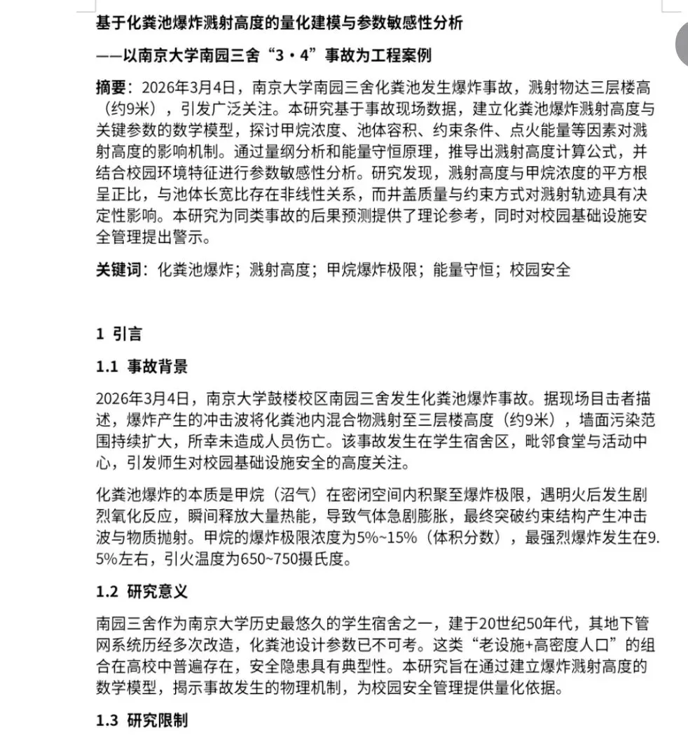 还有行动派学霸,迅速完成一篇题为《基于化粪池爆炸溅射高度的量化建模与参数敏感性分析》。