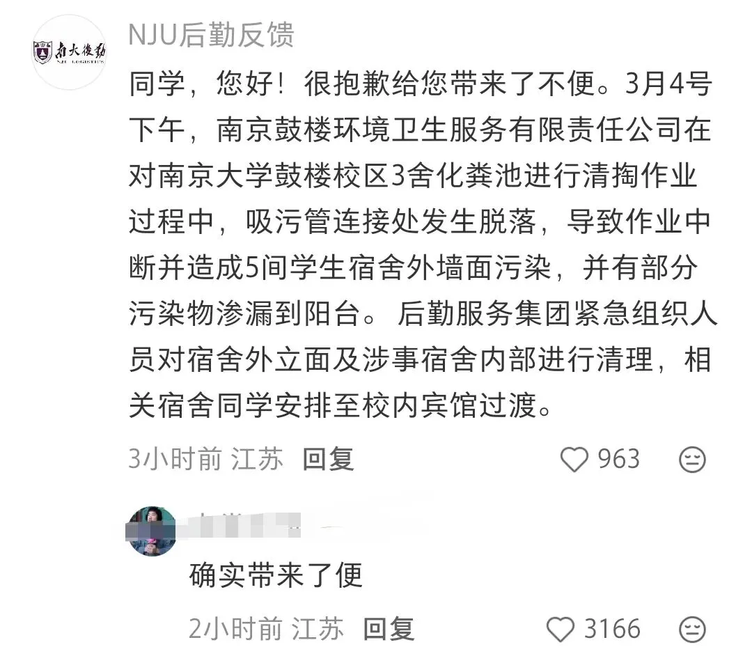 学生发了吐槽帖后,南大后勤反馈官方号火速留言。