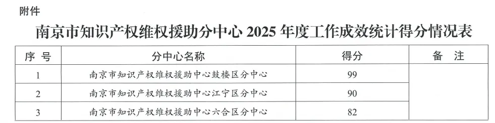 近日,南京市知识产权维权援助分中心2025年工作成绩统计报告新鲜出炉,六合区分中心凭借着82分的优异成绩,获得全市第三名。