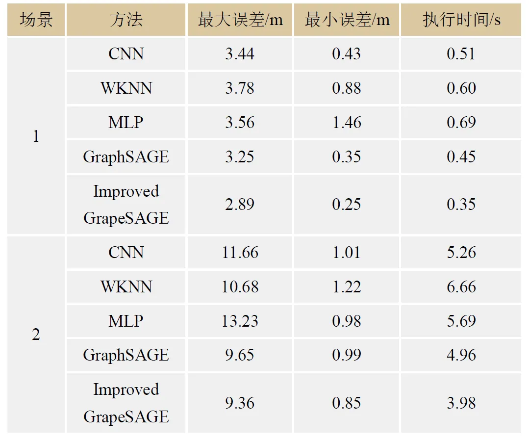 3)为了评估本文定位算法的定位性能,将本文改进的GraphSAGE神经网络定位方法与常用的几种定位方法进行对比实验,结果如表1所示。实验结果证明,提出的改进的GraphSAGE神经网络定位算法有效提高了定位精度,且具有较高的系统稳定性。