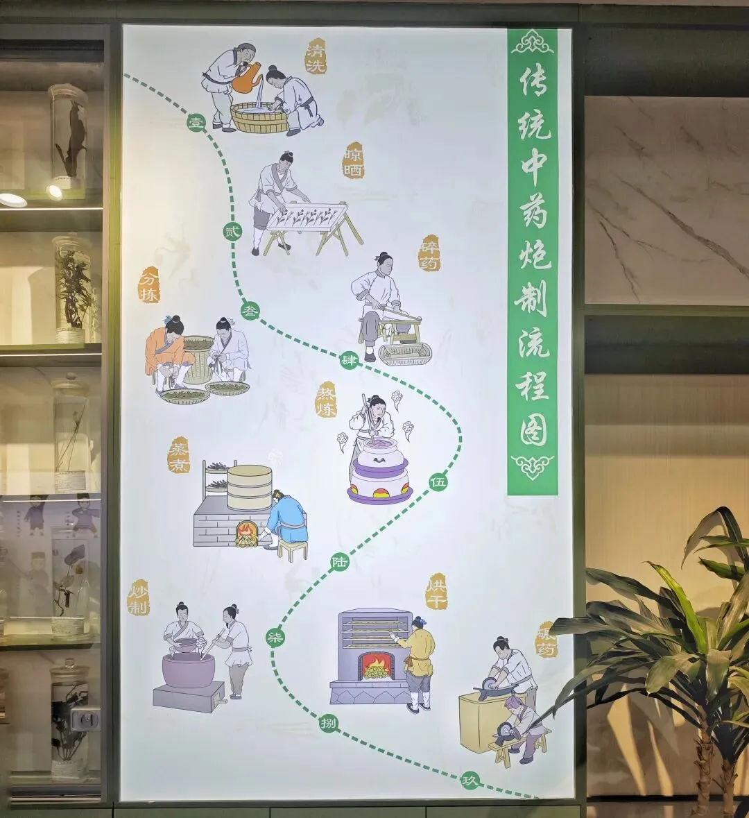中药炮制流程图和铜塑药工,让千年匠心触手可及,仿佛还能闻到药香。