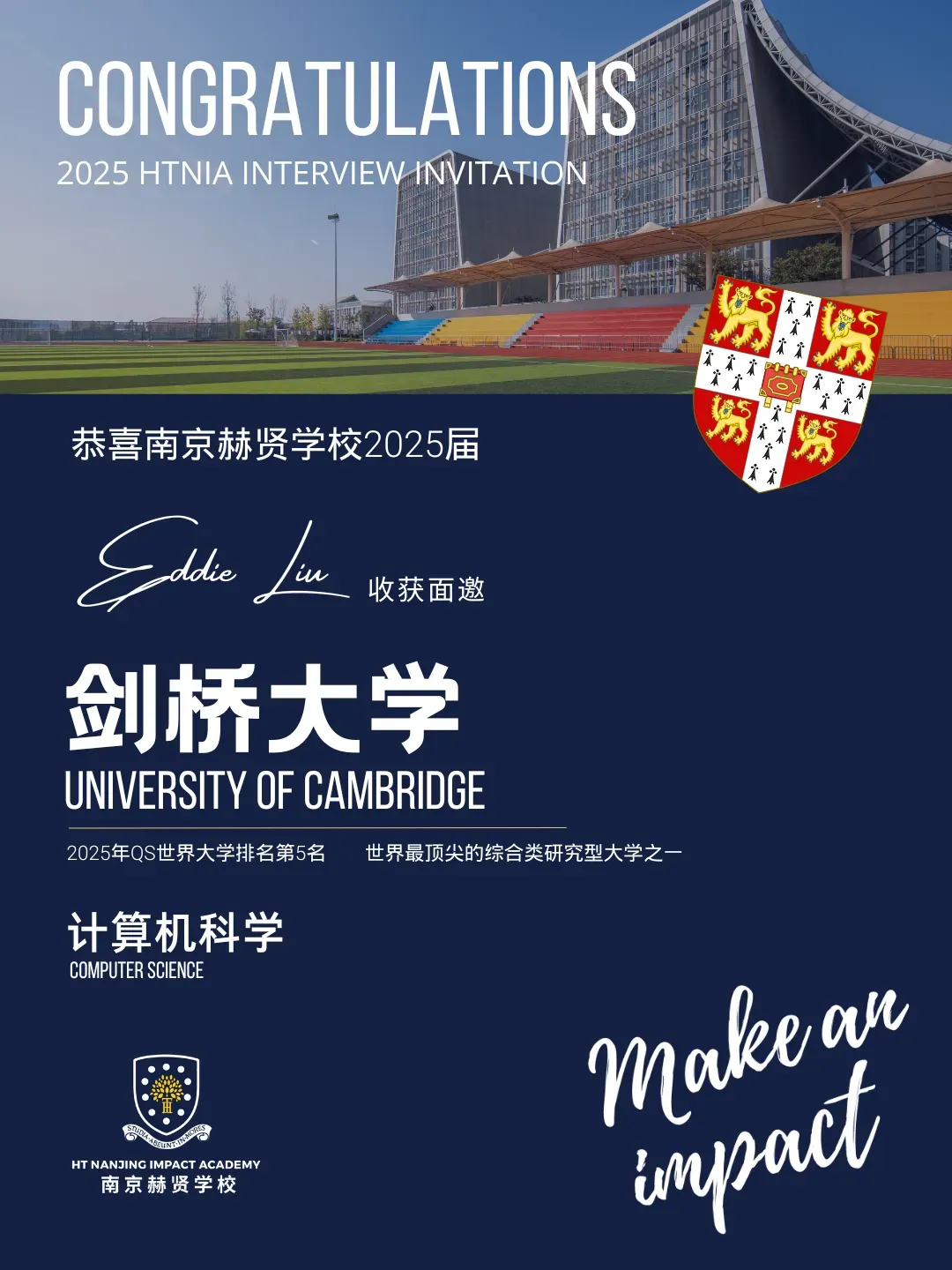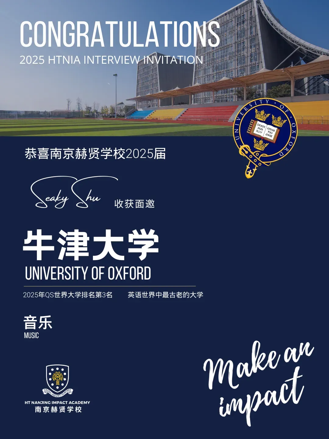 2025届南京赫贤毕业生Seaky Shu和Eddie Liu分别拿到牛津大学和剑桥大学的面试邀请。我们为之感到骄傲和自豪,让我们共同祝贺他们!