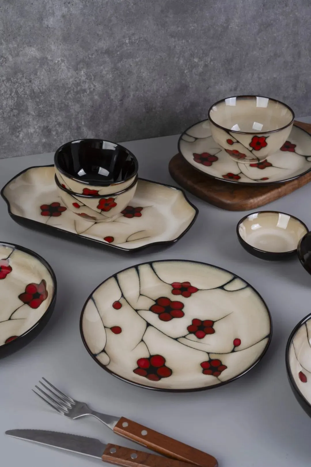 一月梅花,清雅高洁。釉色如寒雪凝霜,黑纹似冰裂铺陈,朱红梅朵缀于其间,红蕊映素胎,宛若“疏影横斜水清浅”的诗意具象,于简约中见风骨。将冬日梅景的清奇与禅意凝于方寸瓷间,食器亦成赏心之景。