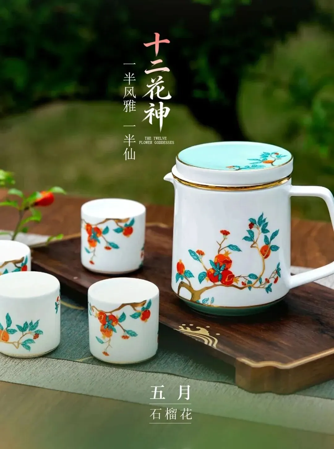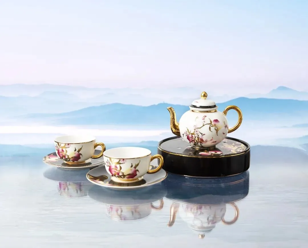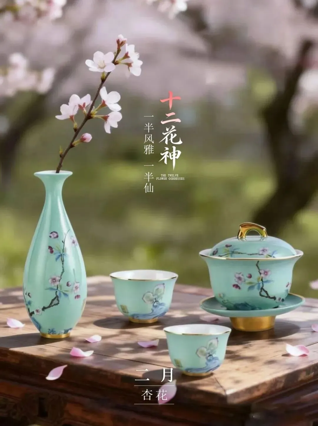 杏花微雨,江南春早。茶具通体施淡青釉,色如春水初融。瓷面绘杏花图,枝蔓虬曲舒展,花瓣轻透娇柔,或含苞待放,或半绽嫣然,将二月杏花 “红芳若玉” 的姿态描摹得惟妙惟肖,一眼望去,便觉春风拂面,雅致天成。