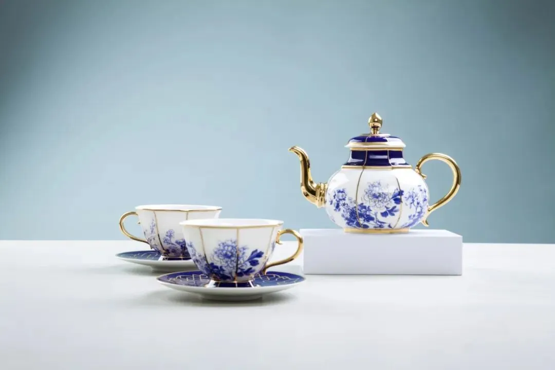 四月牡丹,国色天香。白釉莹润,青花浓淡得宜,层层花瓣舒展如云,尽显花王气度。壶与杯身以鎏金棱线分面,壶流、杯柄与盖钮皆饰鎏金。蓝白相映间,金辉流转,一眼便觉风华绝代。