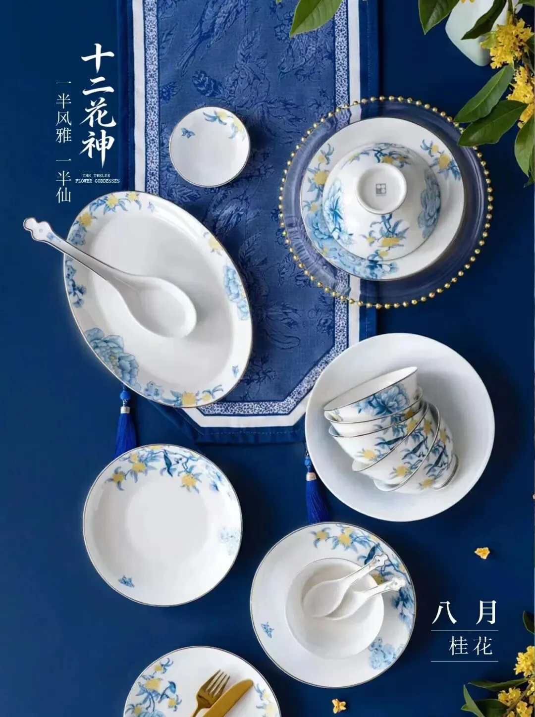 八月桂花,香气清冽。这套桂花瓷具,白釉为底,金蕊簇簇,青枝蔓蔓,配以宝蓝铺陈,恰似月夜桂树,清辉满枝,于素雅中见华贵。