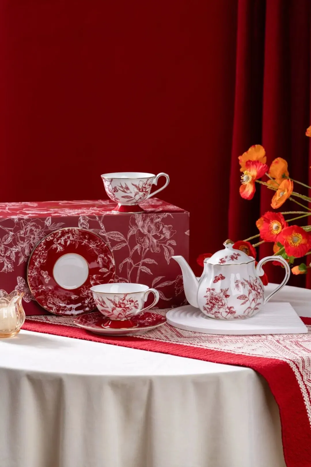 十月芙蓉,拒霜而开。这套茶具以白瓷为底,朱红芙蓉纹晕染其上,偶有蝶影翩跹。红白相映,明丽流转,便有了拒霜的风骨。
