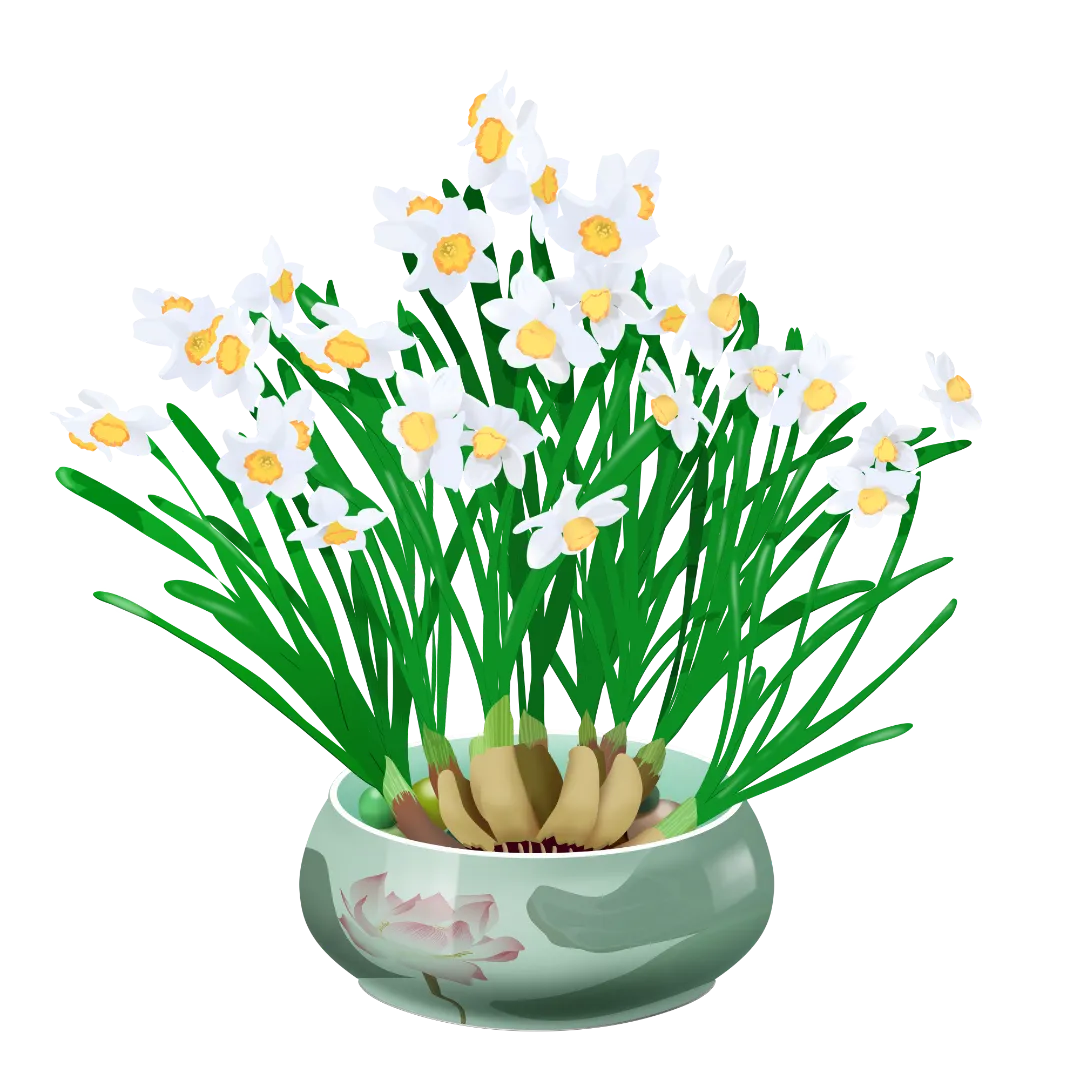 十二月水仙,岁寒清供。这套瓷盘,水仙白瓣莹润,黄蕊灿若金盏,青碧叶茎舒展挺拔。水仙是腊月里的一盆清供,也是中国人心里关于年节的记忆——瓷上有花,岁岁相见。