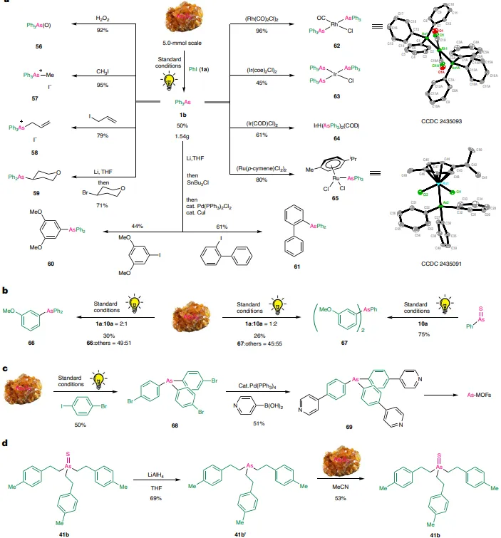 很少有元素能像砷(As)一样,其效用与毒性如此鲜明地取决于具体应用,深刻地体现了化学的两面性。纵观历史,砷在人类文明中扮演了关键角色,其影响力通过有机砷化合物(含有As–C键的化合物)在现代科学中得以延续。然而,长期以来,这些分子的合成一直受制于依赖危险含砷试剂的多步过程,限制了它们的实际应用。2026年3月3日,南京大学史壮志、明斯特大学Frank Glorius在国际知名期刊Nature Chemistry发表题为《Mineral-to-molecule arsenic transfer via photoredox catalysis》的研究论文,Yandong Wang为论文第一作者,史壮志、Frank Glorius为论文共同通讯作者。在本文中,作者展示了一种变革性的“从矿物到分子”的方法,该方法利用光氧化还原催化,在可见光照射下,将天然存在的硫化砷矿物——特别是雌黄(As2S3)——直接转化为多样的有机砷化合物。通过使源自矿物的砷与有机碘化物反应,作者绕过了有毒中间体,从而能够高效、一步构建具有广泛结构多样性的功能化砷化合物。该策略在广泛的底物上得到了验证,为有机砷化合物的合成建立了一条安全、可持续且可扩展的路线,克服了砷化学领域长期存在的挑战。本工作连接了地球化学与合成化学,为环保的分子制造提供了蓝图,将地球的矿产资源转化为高价值的功能分子。砷在人类文明中复杂的两面性——其危险的毒性和变革性的化学用途——是作者对元素性质掌握不断演进的显著证明。自古以来,三氧化二砷(As2O3)作为一种矛盾的物质出现,其致命的毒性被用于政治阴谋,同时在中药和希腊-罗马药典中也扮演着治疗角色。色彩鲜艳的硫化砷矿物雌黄(As2S3)和雄黄(As4S4)在各大洲都有着多方面的应用:作为佛教艺术中经久不衰的颜料、地中海船只的防腐剂以及亚洲农业系统中的害虫控制剂,它们的性质在公元前四世纪的希腊化时期科学汇编中得到了系统性的记载。现代砷化学通过几个关键里程碑得以确立:1649年约翰·施罗德分离出元素砷,随后路易斯-克劳德·卡代·德·加西库尔在1750年代通过三氧化二砷与乙酸钾的反应,开创性地合成了有机砷化合物。罗伯特·本生在19世纪中叶对具有恶臭的卡可基(源自希腊语kakodyl,意为“恶臭”)的表征,为砷的有机金属行为建立了基础性认识。这些发现最终促成了保罗·埃尔利希在1910年开发出洒尔佛散,这是第一种抗菌有机砷药物,也是现代化学疗法的鼻祖。当代科学通过美拉胂醇(用于治疗非洲锥虫病)和达那帕胂(一种抗癌剂)等药物,提升了砷的治疗潜力,达到了前所未有的治疗指数。在合成化学中,有机砷化合物作为许多金属催化反应中的配体,表现出与磷类似物不同的独特催化活性,例如在钯催化的Stille反应中的应用。这些反应在功能材料和天然产物的合成中显示出巨大的应用潜力。此外,Weigand及其同事证明了这些化合物可以通过氧化成鎓反应将白磷转化为有用的磷转移试剂。如今,砷的研究已跨越多个交叉学科领域,包括生物地球化学循环、环境修复、氧化还原催化和先进材料开发。现代主族化学,特别是对重p区氮族元素(As、Sb、Bi)的研究,是一个充满活力且发展迅速的研究领域,有机氮族元素化合物展现出多种迷人的性质。尽管取得了进展,但与较轻的氮和磷类似物相比,这些化合物的合成仍相当不发达,这给其更广泛的应用带来了严峻挑战。目前,有机砷化合物的工业和实验室合成主要受限于对源自As2O3的砷中间体的依赖,这些中间体需要大量的前期制备。这种方法范式还因必须使用但又具限制性的有机金属亲核试剂(基于Li、Mg、Zn和Al的试剂)而存在固有的官能团耐受性限制,这对底物范围和反应设计施加了显著的约束。这些根本性的限制要求使用专门的基础设施来处理危险材料,包括先进的封闭系统和严格的安全规程,从而增加了操作的复杂性和固有风险。为了应对这些关键挑战,迫切需要能够绕过传统有毒前体、同时实现优异官能团耐受性的变革性方法来构建As-C键。在此,作者利用可见光光催化技术,提出了一种从硫化砷矿物直接合成有机砷化合物的“从矿物到分子”的方法。通过使用一种易于获得的铱基光催化剂与叔胺,雌黄能够将砷原子转移给多种芳基和杂芳基碘化物,从而高效、高选择性地生成有机胂。该方法也适用于烷基碘化物,用于生产有机硫化胂。直接使用天然存在的矿物有望建立更安全、更可持续的砷化学框架,可能为跨科学领域的应用开辟新途径。本研究开发了一种利用光氧化还原催化技术,将天然硫化砷矿物(尤其是雌黄)直接转化为多种有机砷化合物的新方法。该成果建立了一条安全、可持续且可扩展的合成路线,克服了传统砷化学中依赖危险试剂和多步反应的挑战,为将地球矿产资源转化为高价值功能分子提供了环保的解决方案。图1: 砷化学背景及本研究发现。a, 人类历史上砷的使用时间线。b, 三苯基胂作为配体在Stille反应中的优异反应活性。c, 有机砷介导的白磷转化。d, 有机砷合成的现状以及“从矿物到分子”范式的发展。图2: 反应条件的优化。a, 光催化剂筛选和对照实验。b, 体系中试剂的探索。c, 反应条件敏感性评估。d, 所测试的光催化剂结构。图3: 机理研究和提出的机理。a, 在可见光照射下,发色团从蓝色转变为橙黄色,证实了H2S副产物的生成。b, 对两种可能的反应中间体PhAs=S和Ph3As=S的验证。c, Stern-Volmer研究表明Et3N在催化循环中作