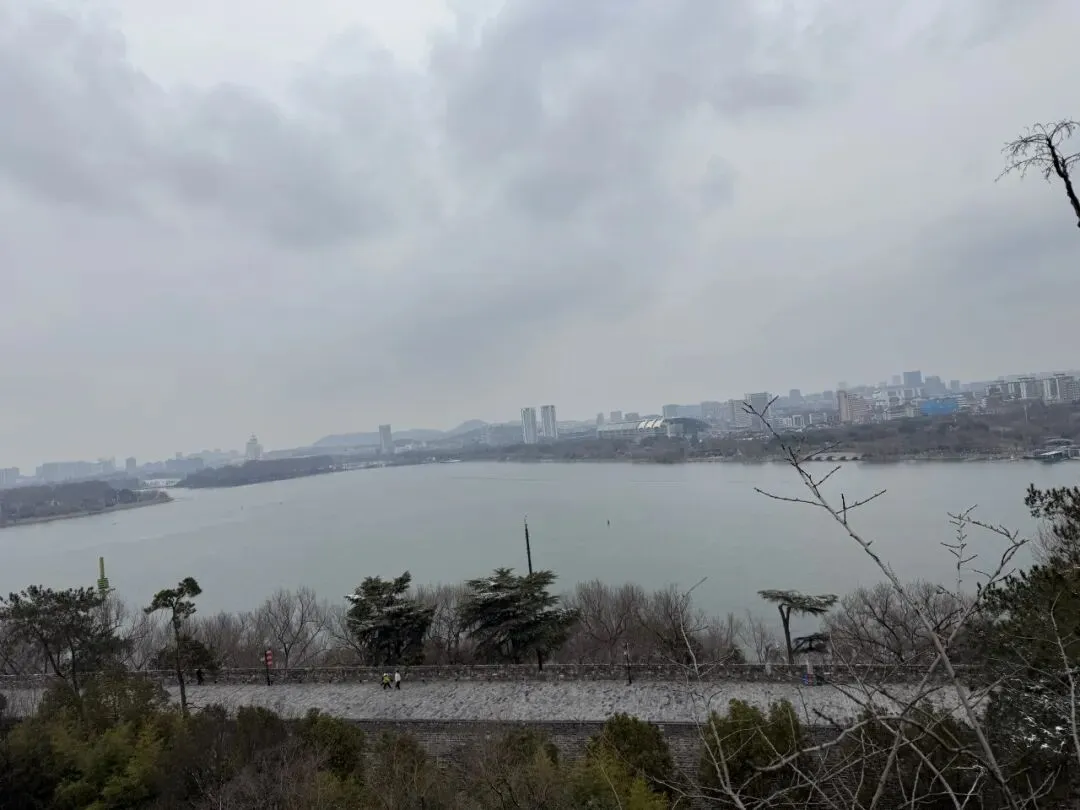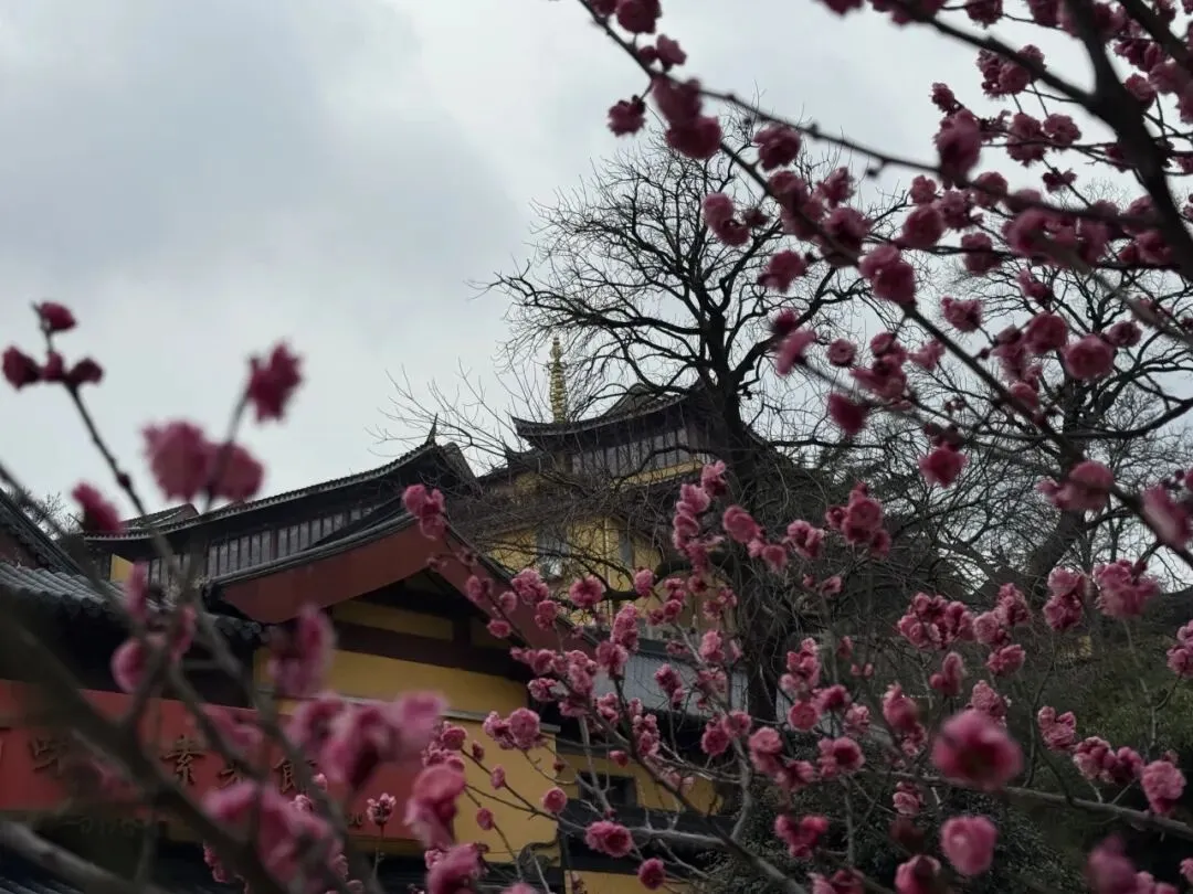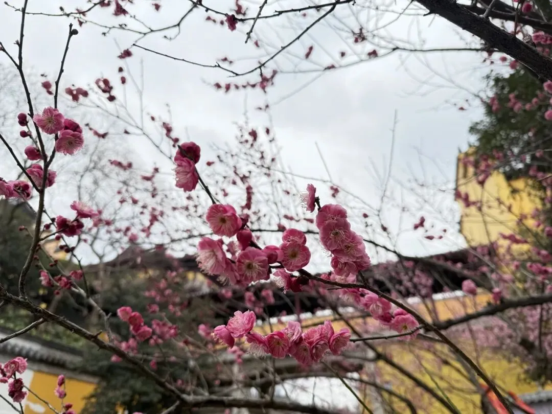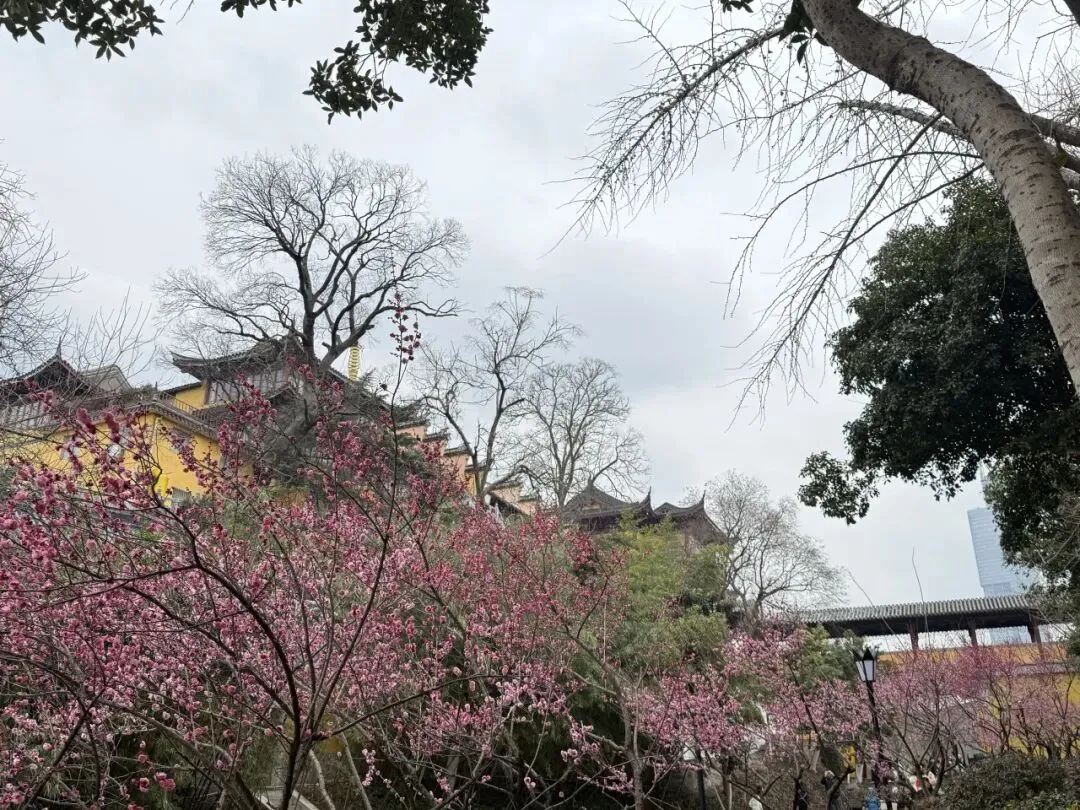 一直走能走到鸡鸣寺,南朝四百八十寺之首,冬樱盛开,青瓦黄墙结合后,虽是寒冬,看起来却春意盎然,虽然那天鸡鸣寺屋顶的雪还没有消融。