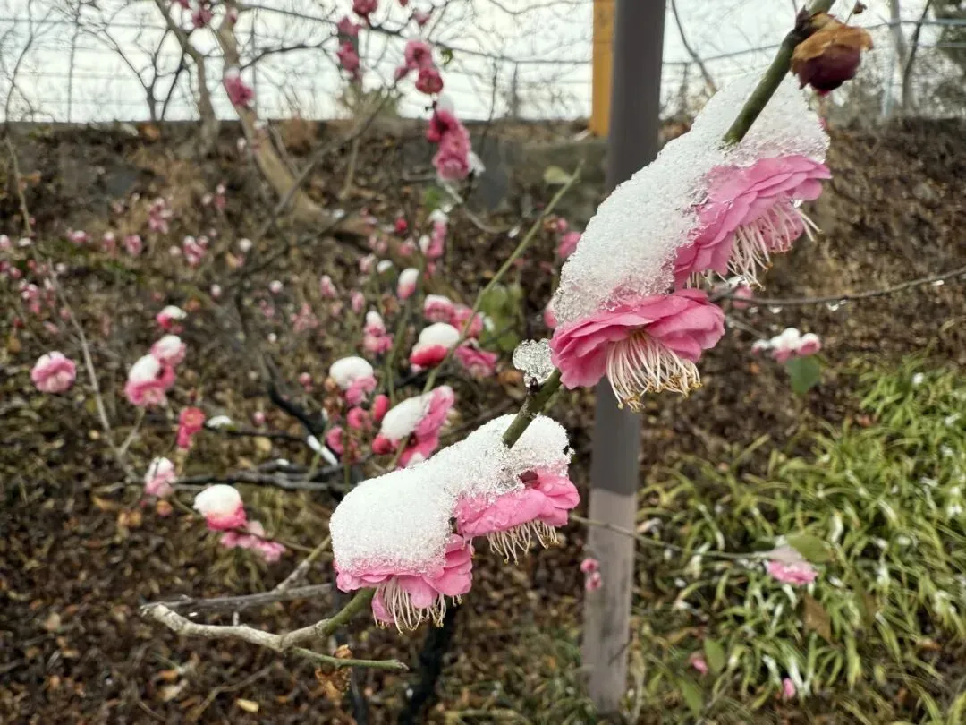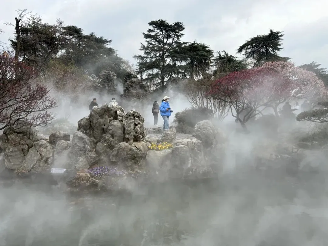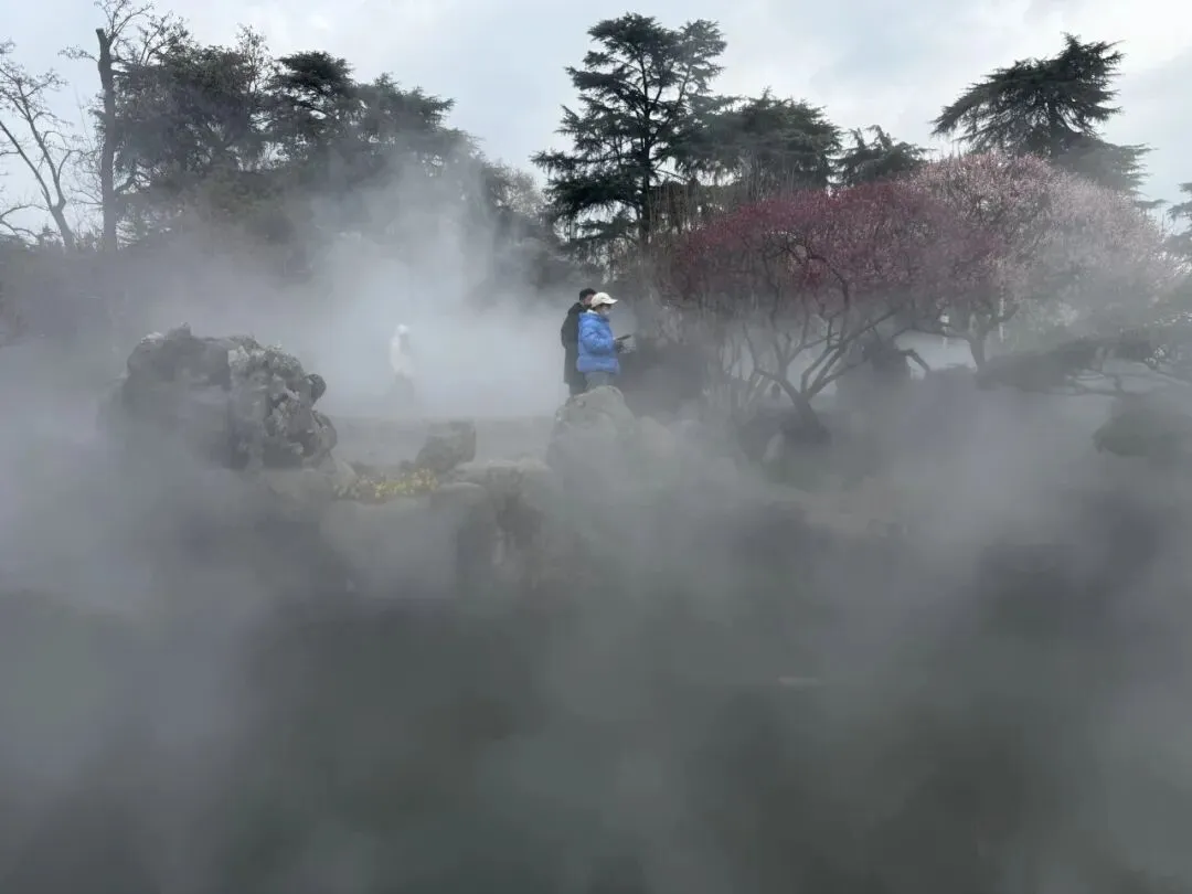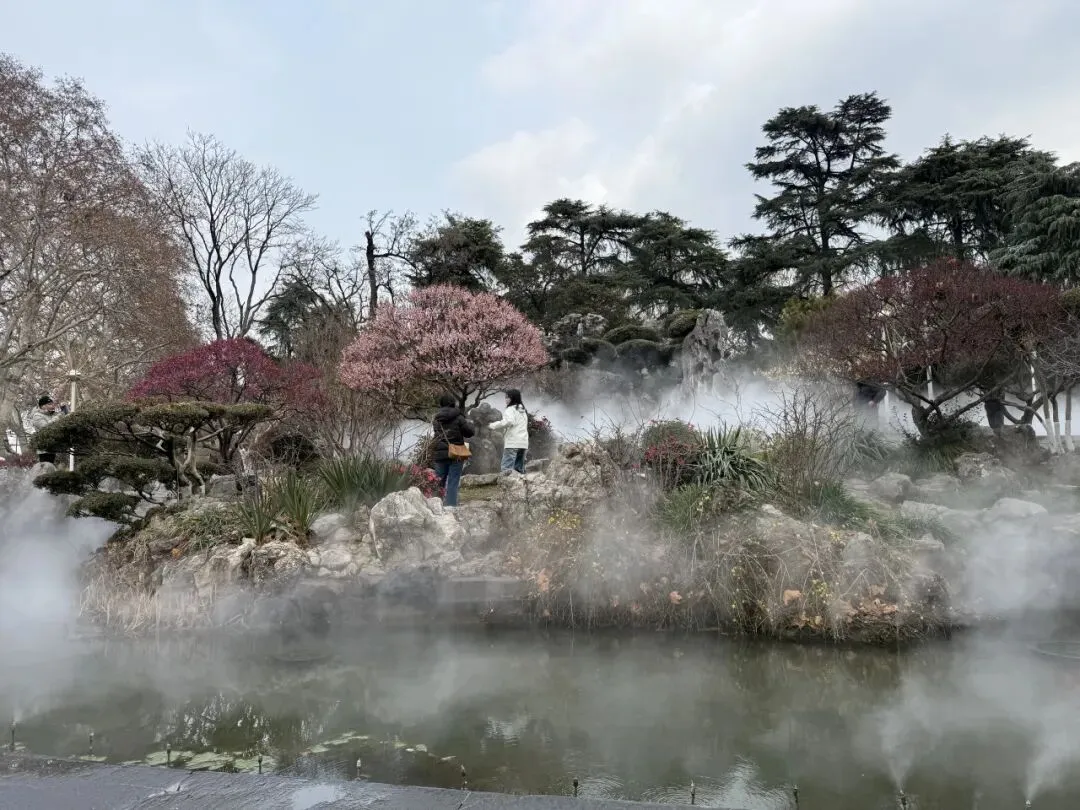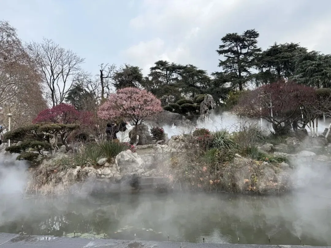 玄武门附近有一个人造景观,会定时喷雾,粉色梅花盛放,立在假山瀑布前,外围都是水池,里面有锦鲤,好似瑶池仙境。