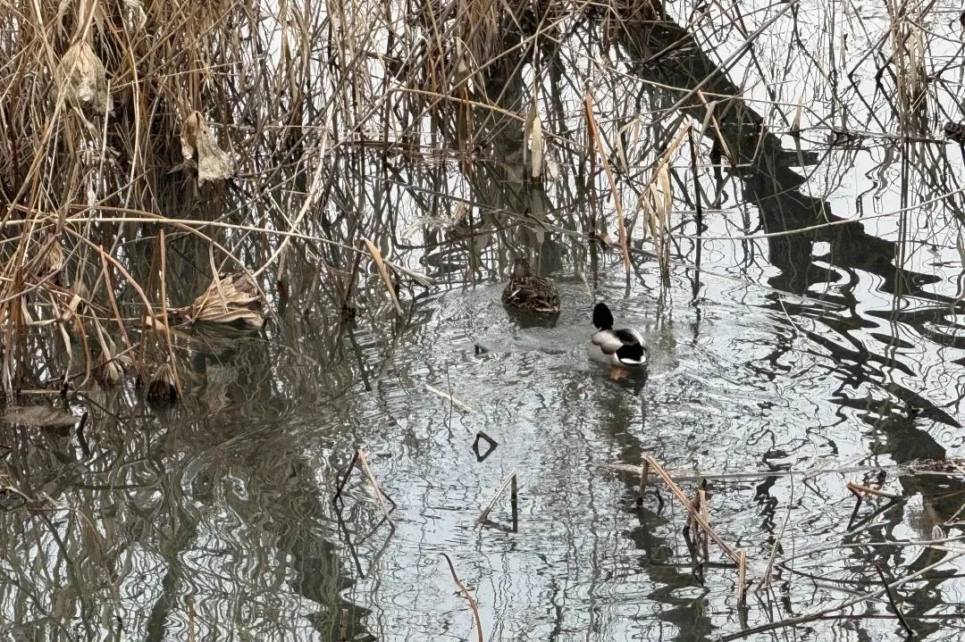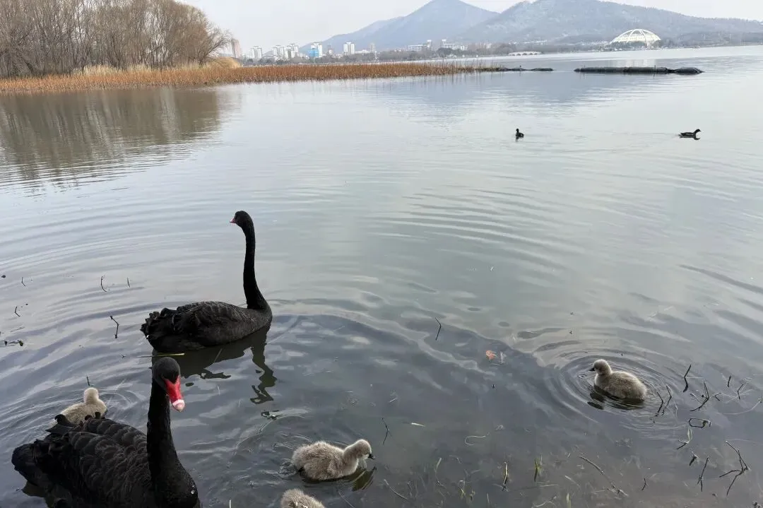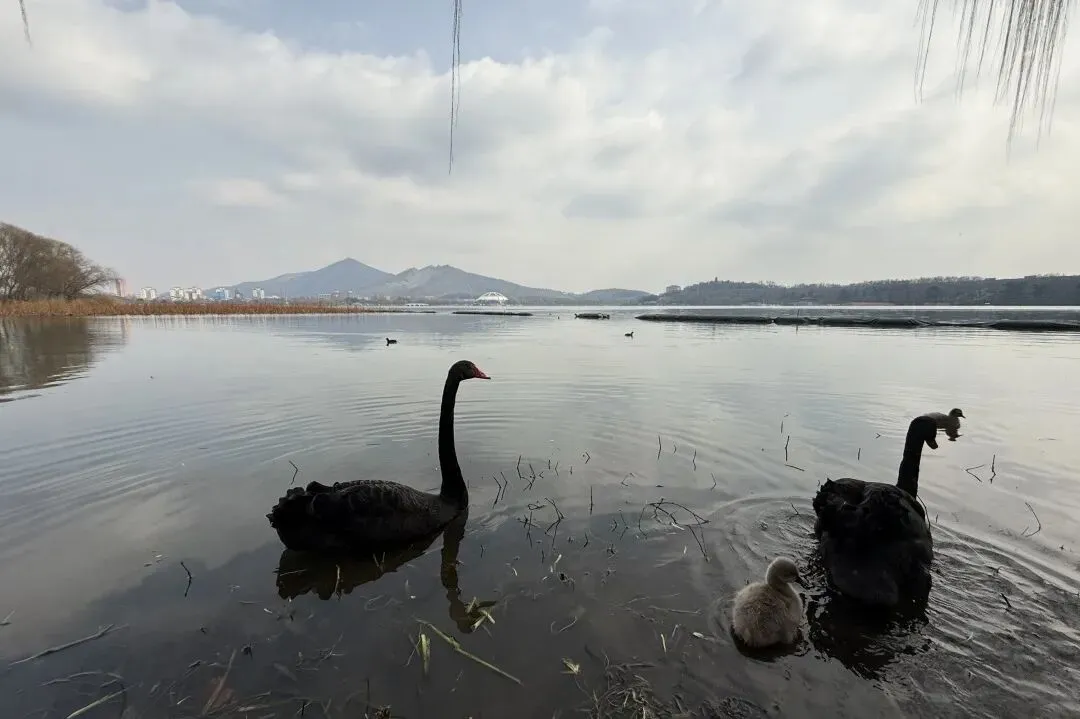 玄武湖里有许多动物,天鹅、鸭子等等,远处的山便是明孝陵的方向。