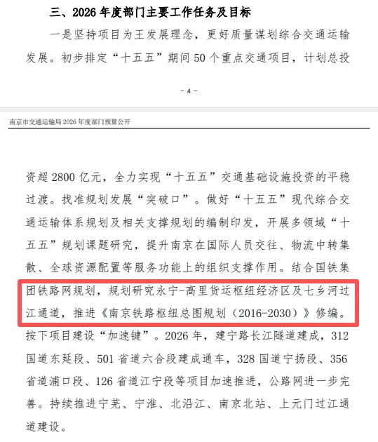 近日,2026年南京市交通运输局部门预算公开,在今年主要工作任务及目标中提到:结合国铁集团规划,规划研究永宁-高里货运枢纽经济区及七乡河过江通道,推进《南京铁路枢纽总图规划(2016-2030)》修编。