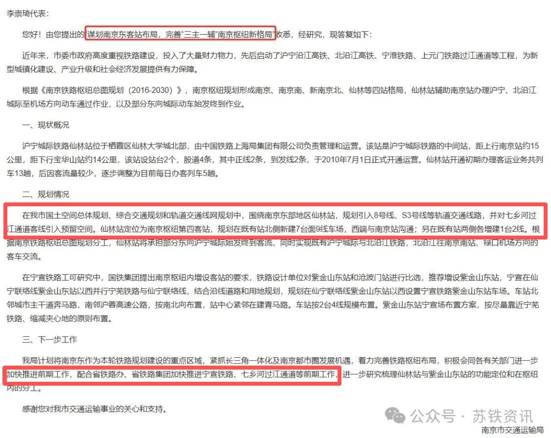 该回复还表示:南京已计划将南京东作为本轮铁路规划建设的重点区域,加快推进宁宣铁路、七乡河过江通道等前期工作,进一步研究梳理仙林站与紫金山东站的功能定位和在枢纽内的分工。