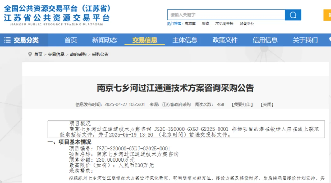 然后2025年,相关部门发布《南京七乡河过江通道技术方案咨询采购公告》,其中显示:计划于2025年5月底完成工作大纲,2025年10月底前形成中间成果,2026年3月底前基本完成技术咨询工作。