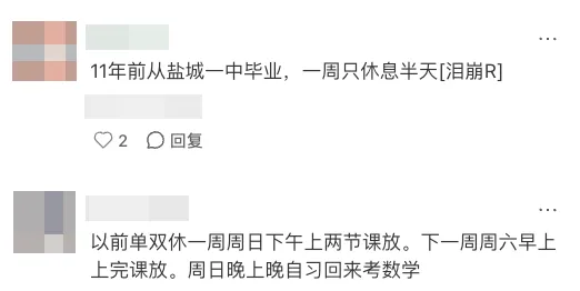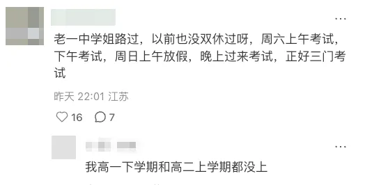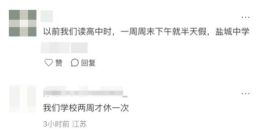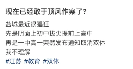 新学期刚刚开始,就有网友在社交平台吐槽:江苏盐城某头部高中初中拔尖提前上高中,还有高一通知取消双休,仅周日放半天假,且下午五点要到校。还有学生表示,盐城一中已经确定单休了,周日正常下午到校考试。苏北教育“死楸”式的应试教育闻名已久,高中的强度更是地狱级别。今天是江苏中小学开学报到的日子,然而,有不少学校已经开始上课了!甚至有学校报到当天直接开考:江北某公办校初二,报道当天开学考,4小时4门。这个学期在校时间短,看来各个学校从第一天就开始赶进度了!这个学期,大家同步开启火箭模式,一起冲吧~丨来源:家长微言、南京探校帮、小红书、南京升学择校