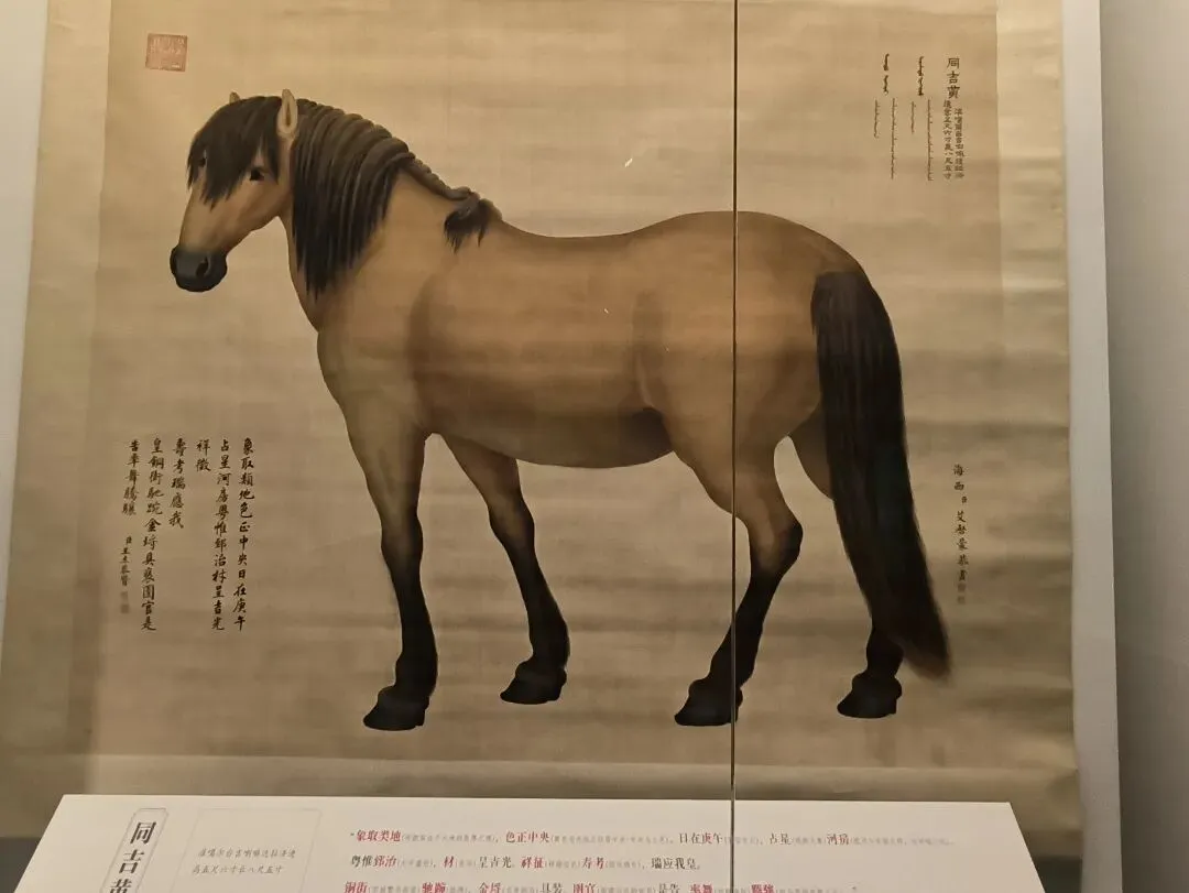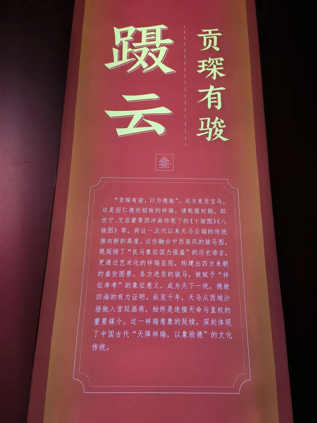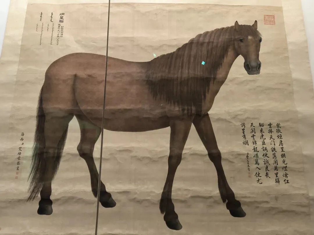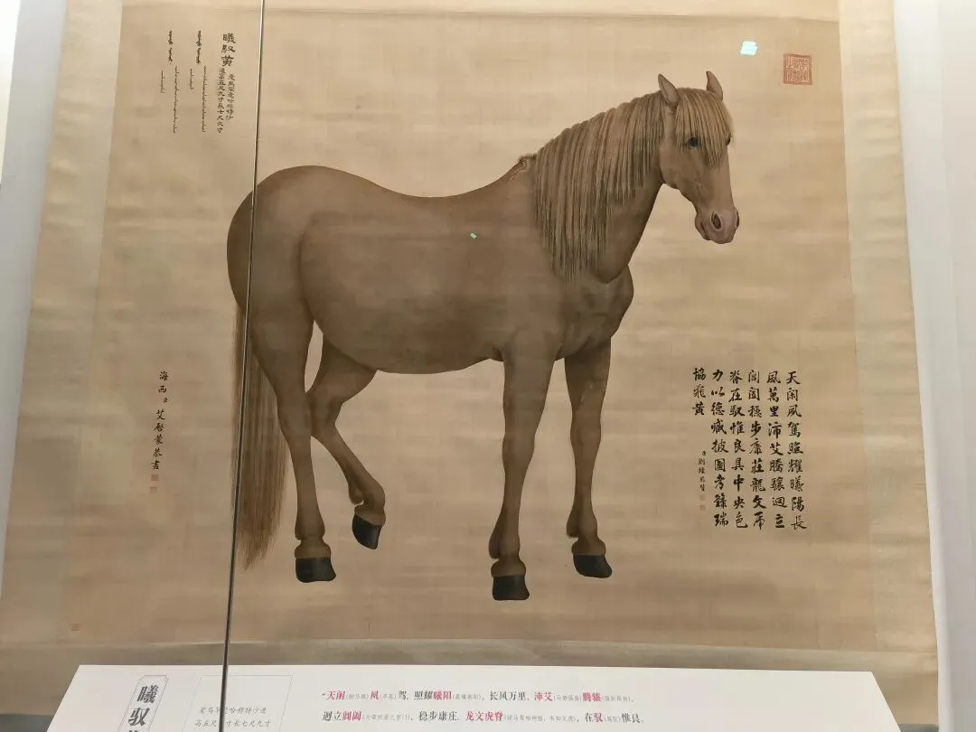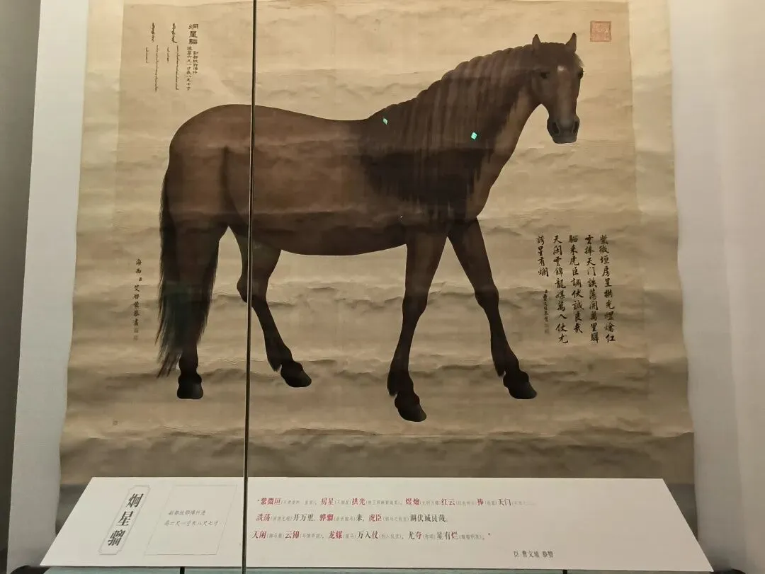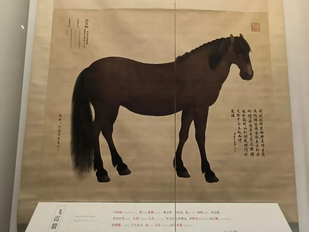 将马称为“龙之媒”,自此与“祥瑞”相关联。汉武帝特制作一批“马蹄金”作为给臣子的特殊赏赐。被汉武帝盛赞的“天马”史书上记载有两种,一为渥洼水马。这“天马”长什么样呢,通过出土的汉代陶马得以窥见,体高腿长,颈昂胸阔,筋骨遒劲且神采飞扬,既具实战之用,亦富审美之姿。汉代除了陶马,更多的是刻在汉画砖上,在多个博物馆设有专题展厅,例如山博、徐博等,马在汉画砖上出现极多。当然,即便引进了好的品种,个体仍有千差万别。在徐州汉画砖艺术馆看到一个石棺床上刻有一幅画——“伯乐相马”,湖南博物馆的马王堆也出土有《相马经》。何为好马就不在这儿研究了,想必这东汉的陶马当是符合“伯乐标准”的好马。“天马”的形象制成陶俑陪葬或是刻在石头上,到了南北朝时期,出现在壁画上并保存至今得以欣赏。这是唐张萱的《虢国夫人游春图》,宋摹本,原作现藏于辽宁省博物馆,展厅中展呈的是印刷品。有的,后面将会看到南博院馆藏的清代画家画的马,到时再与唐人画马作一比较。三彩是对汉代釉陶的发展。随着大唐与西域交流的密切,大量的马、骆驼等形象涌现。“三彩”是在白色素胎上饰以黄、绿、白为主的釉彩,不仅限三彩,最珍贵且少见的是蓝色或黑色,国博有一匹黑釉陶马,可说是这一时期的杰作,无论是釉色还是马的体态和神情刻画皆为佳品。从战国的千乘,到后来称作天马的大宛马,说的是马的改良。这么多马,哪些更有名呢,或者换言之,哪匹马赋予了“名字”?唐贞观十年(公元636年)立于唐太宗昭陵北司马门内的6块大型浮雕石刻,分别名为“拳毛䯄”、“什伐赤”、“白蹄乌”、“特勒骠”、“青骓”以及“飒露紫”。接下来进入明清时期,明代的作品展出《胡笳十八拍》。《胡笳十八拍图》是以蔡文姬归汉为题的叙事性绘画作品。采用分段式构图,通过十八个连续场景展现文姬被掳、思乡、归汉的全过程,画面中人物服饰与建筑形制具有典型明代宫廷绘画特征。清代画作代表是乾隆年间的《八峻图》。这些是真迹,也是此次展品中的重磅文物,听讲解员说,这些真迹原是要带往台北的,因画幅过长过大,没能带走,方成为南博院馆藏,且十二年中展出一次(只在马年展出),此番特展有幸看到。这《八骏图》中的马与真马等大,均为中亚等地进贡清王朝的罕见名马,神形各异,栩栩如生。艾启蒙(1708—1780),字醒庵,波西米亚(今属捷克)人,天主教耶稣会传教士,乾隆十年(1745)来华,师从郎世宁研习绘画。师从郎世宁,故尔艾启蒙画马,既具有中国传统绘画中的写意,又兼西方绘画的写实。曹文埴(1735年—1798年),同其子曹振镛世称“父子宰相”,从乾隆二十五年(1760年)到道光十五年(1835年),历三代皇帝。把持朝政75年,清王朝几乎有大半历史都在他们父子的影响之下。再看另一幅画作,题写者:刘墉(1720年—1805年)。刘墉,军机大臣刘统勋之子,一生为官五十余载,宦海沉浮,几经起落,有说他为官清廉,也有说他为人圆滑。字如其人,其品性可通过书法窥见一二。王杰(1725年—1805年),清朝状元、陕西第一名臣。在朝四十余年,忠清劲直,老成端谨,不结党营私,不趋炎附势,斗倒和珅的“勇士”。为官四十载,所带之物唯有书籍数十箱,嘉庆帝盛赞其“直道一身立庙堂,清风两袖返韩城”。艾启蒙的《八骏图》,南博院将其制作成动画,在展厅内循环播放。马,龙之媒也,除了以画作、雕刻的方式呈现,还展呈了几件清宫中的珍品,这三件为清康熙年间的素三彩龙纹盘。此卷为董其昌临米芾《天马赋》,绢本大字,用笔跳宕雄健。董其昌的行书从中年开始受米芾的影响,此赋文辞与书法均为米芾佳作,深为董氏欣赏。南博院展品丰富,每次借不同的主题将馆藏的文物拿出来展呈。马年说马,顺便将南博院其他展厅中关于马的内容一并“挑出来”,罗列于此。特展馆二层,位于“天马应瑞展”的楼上是另一临展:璀璨的凝结,格拉斯哥博物馆藏,意大利绘画大师作品展。其制作年代约在1600年,中国的明朝,苏西尼创作的青铜雕塑。下面这件刻有四个“海马”造型的是件漆器,清乾隆时期的剔红波涛海马纹盖盒。这件紫砂胎剔红人物故事图八角壶(图案中有马),同样是件漆器,所不同的是紫砂胎底,实为罕见,也是清乾隆时期作品,也是在“镂云裁月”展厅中展呈。一圈转下来,从古代江苏到明清,历代“马”的文物少见,多集中于唐代,仍以唐三彩居多。还有一件彩绘陶马,相对于其他“花里胡哨”的“三彩”更喜欢这件陶马。看过各个时期,不同形式的“马”,走出展馆,外面草地上还有一匹“铸铜彩绘”马。题为“逐梦记”,显然这是一件艺术作品,赋予“马”以新的内涵,不再局限于祥瑞和“天马”。当离开马很远之后,再回望它,一幅忧伤的样子。