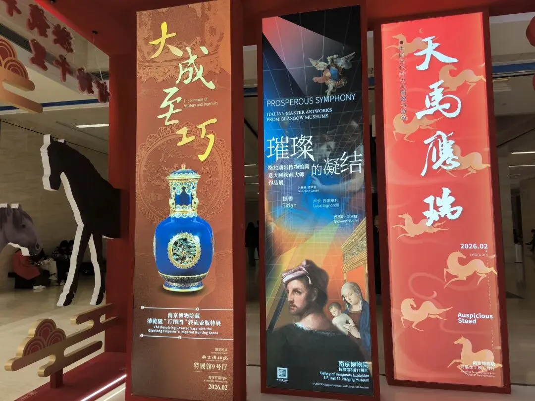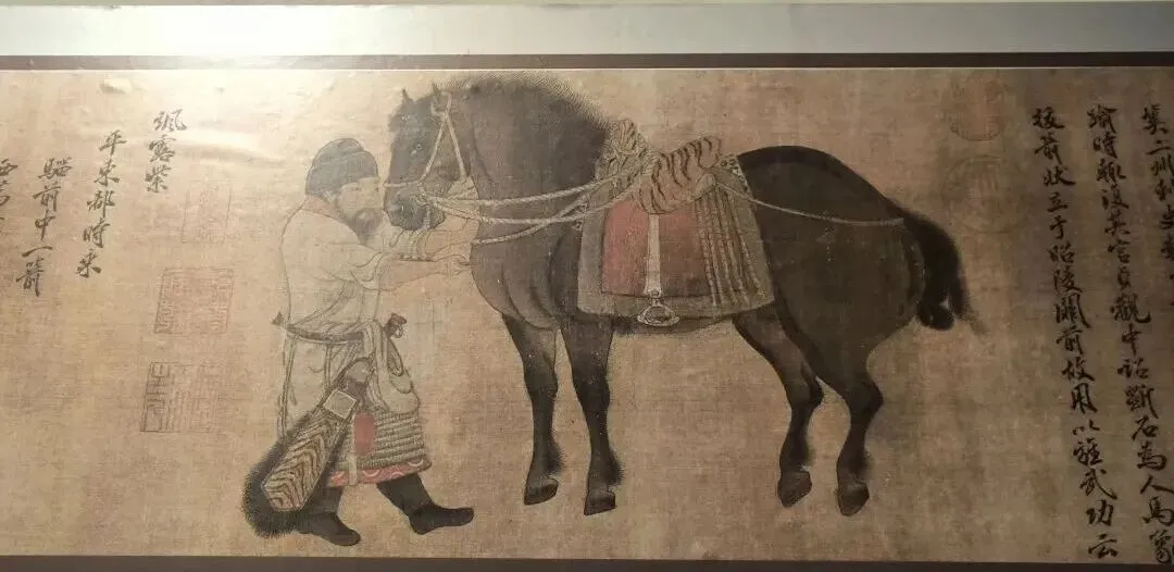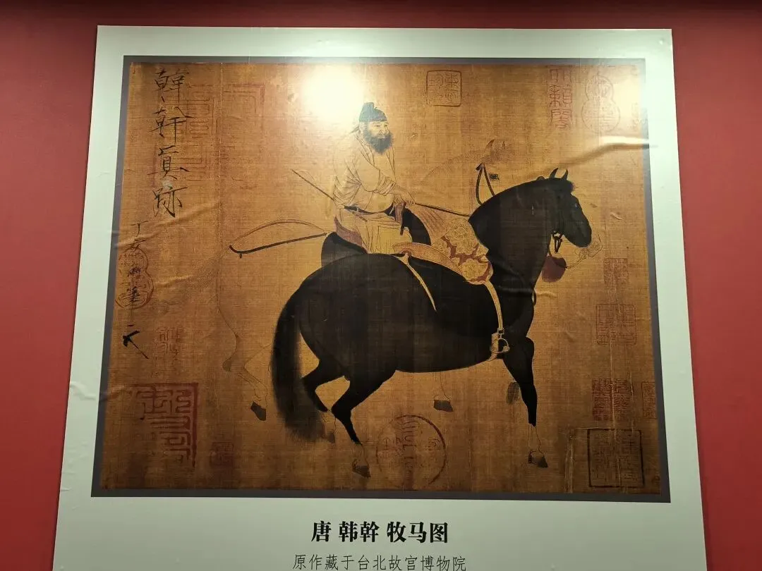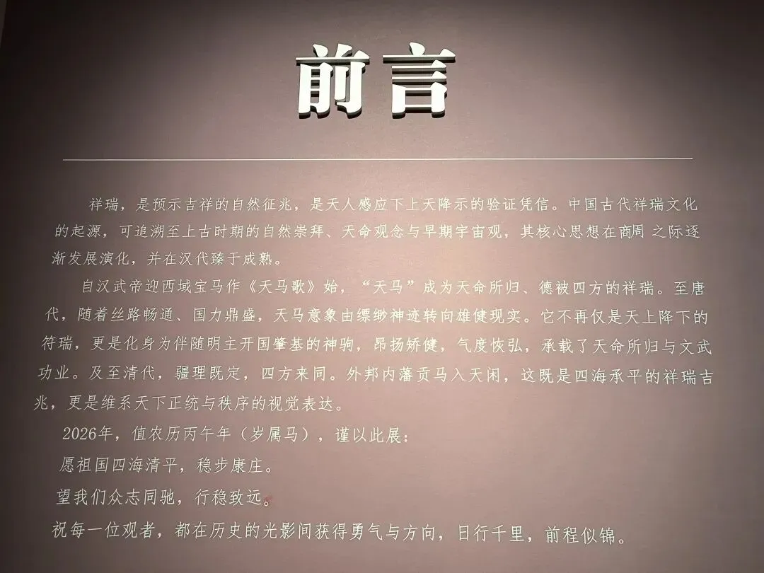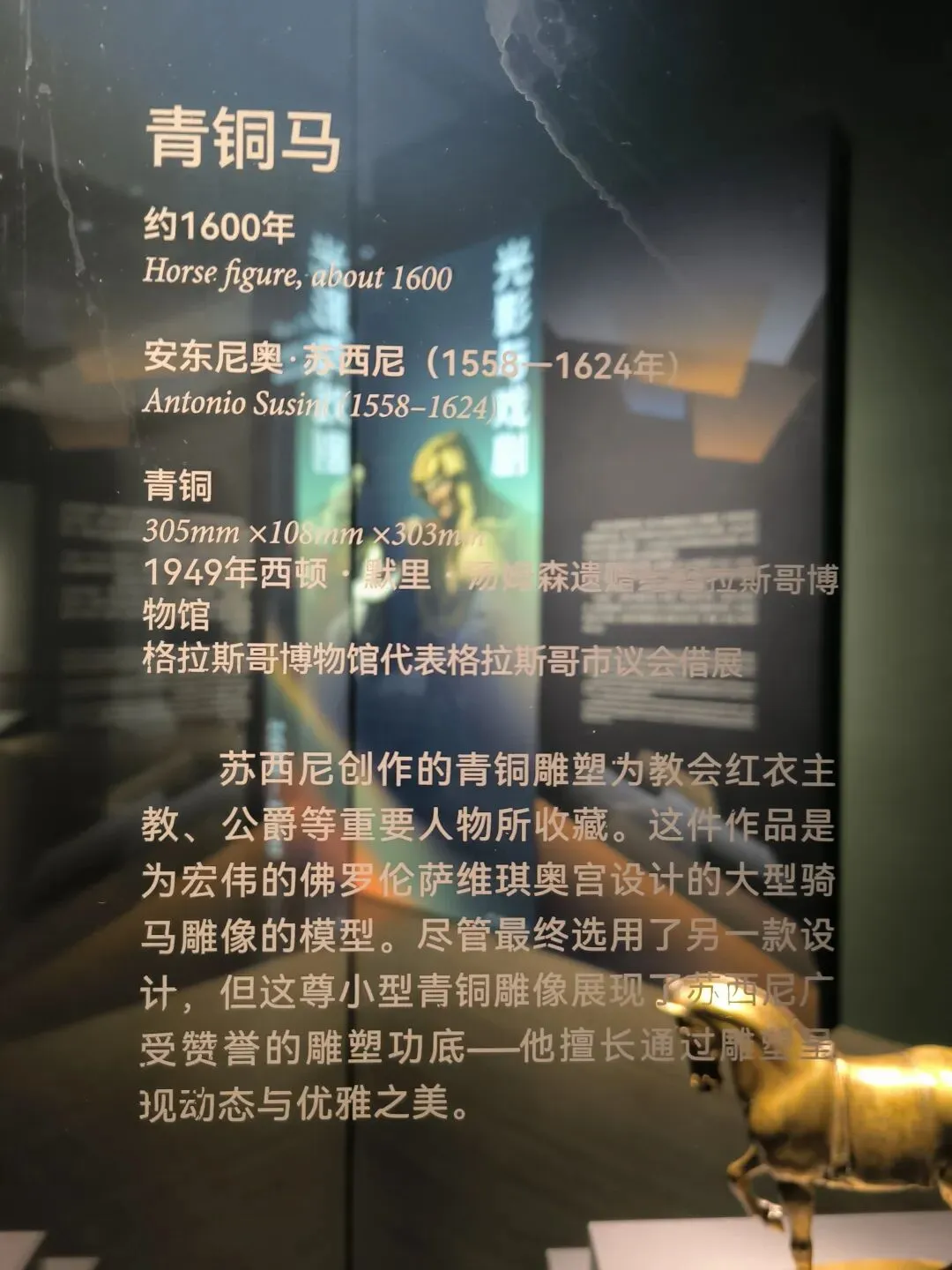 将马称为“龙之媒”,自此与“祥瑞”相关联。汉武帝特制作一批“马蹄金”作为给臣子的特殊赏赐。被汉武帝盛赞的“天马”史书上记载有两种,一为渥洼水马。这“天马”长什么样呢,通过出土的汉代陶马得以窥见,体高腿长,颈昂胸阔,筋骨遒劲且神采飞扬,既具实战之用,亦富审美之姿。汉代除了陶马,更多的是刻在汉画砖上,在多个博物馆设有专题展厅,例如山博、徐博等,马在汉画砖上出现极多。当然,即便引进了好的品种,个体仍有千差万别。在徐州汉画砖艺术馆看到一个石棺床上刻有一幅画——“伯乐相马”,湖南博物馆的马王堆也出土有《相马经》。何为好马就不在这儿研究了,想必这东汉的陶马当是符合“伯乐标准”的好马。“天马”的形象制成陶俑陪葬或是刻在石头上,到了南北朝时期,出现在壁画上并保存至今得以欣赏。这是唐张萱的《虢国夫人游春图》,宋摹本,原作现藏于辽宁省博物馆,展厅中展呈的是印刷品。有的,后面将会看到南博院馆藏的清代画家画的马,到时再与唐人画马作一比较。三彩是对汉代釉陶的发展。随着大唐与西域交流的密切,大量的马、骆驼等形象涌现。“三彩”是在白色素胎上饰以黄、绿、白为主的釉彩,不仅限三彩,最珍贵且少见的是蓝色或黑色,国博有一匹黑釉陶马,可说是这一时期的杰作,无论是釉色还是马的体态和神情刻画皆为佳品。从战国的千乘,到后来称作天马的大宛马,说的是马的改良。这么多马,哪些更有名呢,或者换言之,哪匹马赋予了“名字”?唐贞观十年(公元636年)立于唐太宗昭陵北司马门内的6块大型浮雕石刻,分别名为“拳毛䯄”、“什伐赤”、“白蹄乌”、“特勒骠”、“青骓”以及“飒露紫”。接下来进入明清时期,明代的作品展出《胡笳十八拍》。《胡笳十八拍图》是以蔡文姬归汉为题的叙事性绘画作品。采用分段式构图,通过十八个连续场景展现文姬被掳、思乡、归汉的全过程,画面中人物服饰与建筑形制具有典型明代宫廷绘画特征。清代画作代表是乾隆年间的《八峻图》。这些是真迹,也是此次展品中的重磅文物,听讲解员说,这些真迹原是要带往台北的,因画幅过长过大,没能带走,方成为南博院馆藏,且十二年中展出一次(只在马年展出),此番特展有幸看到。这《八骏图》中的马与真马等大,均为中亚等地进贡清王朝的罕见名马,神形各异,栩栩如生。艾启蒙(1708—1780),字醒庵,波西米亚(今属捷克)人,天主教耶稣会传教士,乾隆十年(1745)来华,师从郎世宁研习绘画。师从郎世宁,故尔艾启蒙画马,既具有中国传统绘画中的写意,又兼西方绘画的写实。曹文埴(1735年—1798年),同其子曹振镛世称“父子宰相”,从乾隆二十五年(1760年)到道光十五年(1835年),历三代皇帝。把持朝政75年,清王朝几乎有大半历史都在他们父子的影响之下。再看另一幅画作,题写者:刘墉(1720年—1805年)。刘墉,军机大臣刘统勋之子,一生为官五十余载,宦海沉浮,几经起落,有说他为官清廉,也有说他为人圆滑。字如其人,其品性可通过书法窥见一二。王杰(1725年—1805年),清朝状元、陕西第一名臣。在朝四十余年,忠清劲直,老成端谨,不结党营私,不趋炎附势,斗倒和珅的“勇士”。为官四十载,所带之物唯有书籍数十箱,嘉庆帝盛赞其“直道一身立庙堂,清风两袖返韩城”。艾启蒙的《八骏图》,南博院将其制作成动画,在展厅内循环播放。马,龙之媒也,除了以画作、雕刻的方式呈现,还展呈了几件清宫中的珍品,这三件为清康熙年间的素三彩龙纹盘。此卷为董其昌临米芾《天马赋》,绢本大字,用笔跳宕雄健。董其昌的行书从中年开始受米芾的影响,此赋文辞与书法均为米芾佳作,深为董氏欣赏。南博院展品丰富,每次借不同的主题将馆藏的文物拿出来展呈。马年说马,顺便将南博院其他展厅中关于马的内容一并“挑出来”,罗列于此。特展馆二层,位于“天马应瑞展”的楼上是另一临展:璀璨的凝结,格拉斯哥博物馆藏,意大利绘画大师作品展。其制作年代约在1600年,中国的明朝,苏西尼创作的青铜雕塑。下面这件刻有四个“海马”造型的是件漆器,清乾隆时期的剔红波涛海马纹盖盒。这件紫砂胎剔红人物故事图八角壶(图案中有马),同样是件漆器,所不同的是紫砂胎底,实为罕见,也是清乾隆时期作品,也是在“镂云裁月”展厅中展呈。一圈转下来,从古代江苏到明清,历代“马”的文物少见,多集中于唐代,仍以唐三彩居多。还有一件彩绘陶马,相对于其他“花里胡哨”的“三彩”更喜欢这件陶马。看过各个时期,不同形式的“马”,走出展馆,外面草地上还有一匹“铸铜彩绘”马。题为“逐梦记”,显然这是一件艺术作品,赋予“马”以新的内涵,不再局限于祥瑞和“天马”。当离开马很远之后,再回望它,一幅忧伤的样子。