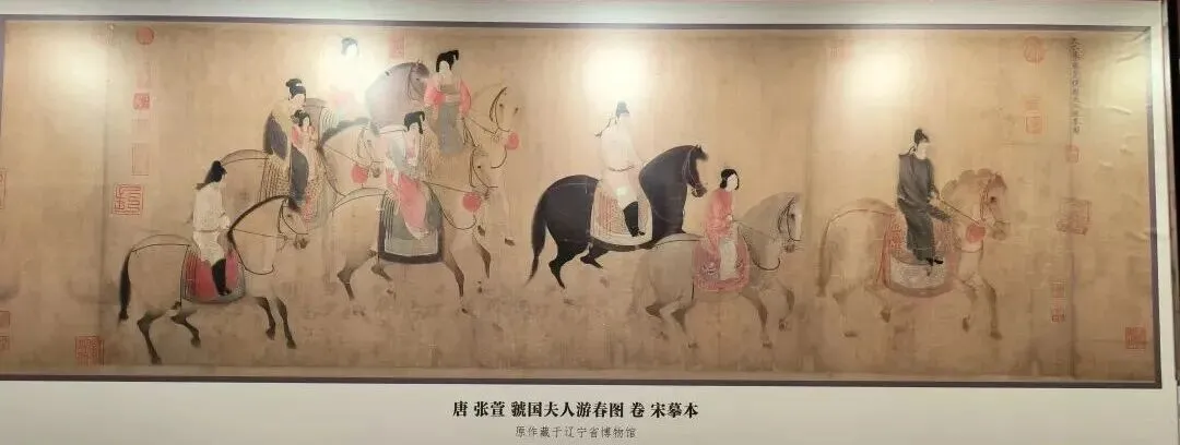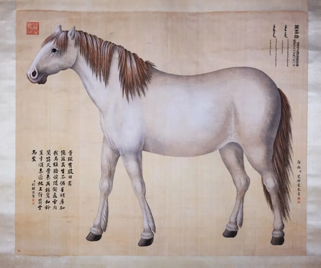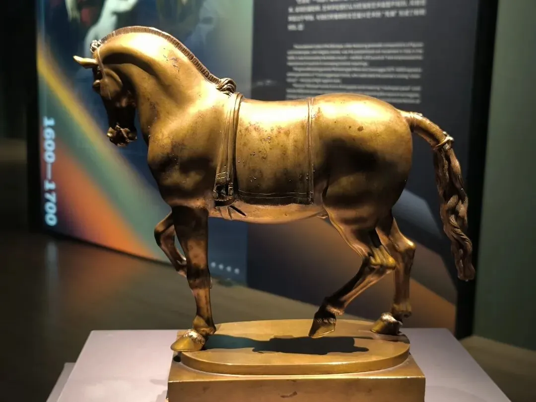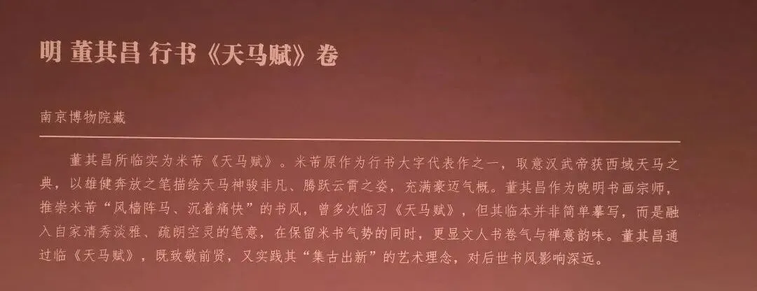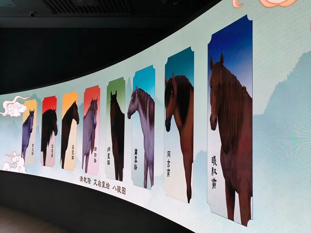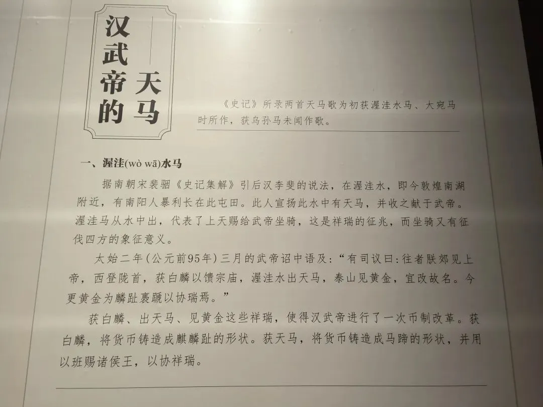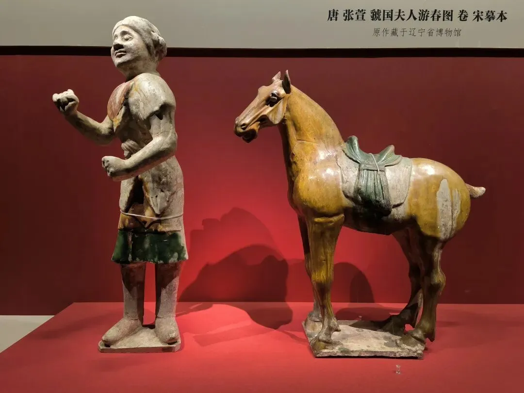 将马称为“龙之媒”,自此与“祥瑞”相关联。汉武帝特制作一批“马蹄金”作为给臣子的特殊赏赐。被汉武帝盛赞的“天马”史书上记载有两种,一为渥洼水马。这“天马”长什么样呢,通过出土的汉代陶马得以窥见,体高腿长,颈昂胸阔,筋骨遒劲且神采飞扬,既具实战之用,亦富审美之姿。汉代除了陶马,更多的是刻在汉画砖上,在多个博物馆设有专题展厅,例如山博、徐博等,马在汉画砖上出现极多。当然,即便引进了好的品种,个体仍有千差万别。在徐州汉画砖艺术馆看到一个石棺床上刻有一幅画——“伯乐相马”,湖南博物馆的马王堆也出土有《相马经》。何为好马就不在这儿研究了,想必这东汉的陶马当是符合“伯乐标准”的好马。“天马”的形象制成陶俑陪葬或是刻在石头上,到了南北朝时期,出现在壁画上并保存至今得以欣赏。这是唐张萱的《虢国夫人游春图》,宋摹本,原作现藏于辽宁省博物馆,展厅中展呈的是印刷品。有的,后面将会看到南博院馆藏的清代画家画的马,到时再与唐人画马作一比较。三彩是对汉代釉陶的发展。随着大唐与西域交流的密切,大量的马、骆驼等形象涌现。“三彩”是在白色素胎上饰以黄、绿、白为主的釉彩,不仅限三彩,最珍贵且少见的是蓝色或黑色,国博有一匹黑釉陶马,可说是这一时期的杰作,无论是釉色还是马的体态和神情刻画皆为佳品。从战国的千乘,到后来称作天马的大宛马,说的是马的改良。这么多马,哪些更有名呢,或者换言之,哪匹马赋予了“名字”?唐贞观十年(公元636年)立于唐太宗昭陵北司马门内的6块大型浮雕石刻,分别名为“拳毛䯄”、“什伐赤”、“白蹄乌”、“特勒骠”、“青骓”以及“飒露紫”。接下来进入明清时期,明代的作品展出《胡笳十八拍》。《胡笳十八拍图》是以蔡文姬归汉为题的叙事性绘画作品。采用分段式构图,通过十八个连续场景展现文姬被掳、思乡、归汉的全过程,画面中人物服饰与建筑形制具有典型明代宫廷绘画特征。清代画作代表是乾隆年间的《八峻图》。这些是真迹,也是此次展品中的重磅文物,听讲解员说,这些真迹原是要带往台北的,因画幅过长过大,没能带走,方成为南博院馆藏,且十二年中展出一次(只在马年展出),此番特展有幸看到。这《八骏图》中的马与真马等大,均为中亚等地进贡清王朝的罕见名马,神形各异,栩栩如生。艾启蒙(1708—1780),字醒庵,波西米亚(今属捷克)人,天主教耶稣会传教士,乾隆十年(1745)来华,师从郎世宁研习绘画。师从郎世宁,故尔艾启蒙画马,既具有中国传统绘画中的写意,又兼西方绘画的写实。曹文埴(1735年—1798年),同其子曹振镛世称“父子宰相”,从乾隆二十五年(1760年)到道光十五年(1835年),历三代皇帝。把持朝政75年,清王朝几乎有大半历史都在他们父子的影响之下。再看另一幅画作,题写者:刘墉(1720年—1805年)。刘墉,军机大臣刘统勋之子,一生为官五十余载,宦海沉浮,几经起落,有说他为官清廉,也有说他为人圆滑。字如其人,其品性可通过书法窥见一二。王杰(1725年—1805年),清朝状元、陕西第一名臣。在朝四十余年,忠清劲直,老成端谨,不结党营私,不趋炎附势,斗倒和珅的“勇士”。为官四十载,所带之物唯有书籍数十箱,嘉庆帝盛赞其“直道一身立庙堂,清风两袖返韩城”。艾启蒙的《八骏图》,南博院将其制作成动画,在展厅内循环播放。马,龙之媒也,除了以画作、雕刻的方式呈现,还展呈了几件清宫中的珍品,这三件为清康熙年间的素三彩龙纹盘。此卷为董其昌临米芾《天马赋》,绢本大字,用笔跳宕雄健。董其昌的行书从中年开始受米芾的影响,此赋文辞与书法均为米芾佳作,深为董氏欣赏。南博院展品丰富,每次借不同的主题将馆藏的文物拿出来展呈。马年说马,顺便将南博院其他展厅中关于马的内容一并“挑出来”,罗列于此。特展馆二层,位于“天马应瑞展”的楼上是另一临展:璀璨的凝结,格拉斯哥博物馆藏,意大利绘画大师作品展。其制作年代约在1600年,中国的明朝,苏西尼创作的青铜雕塑。下面这件刻有四个“海马”造型的是件漆器,清乾隆时期的剔红波涛海马纹盖盒。这件紫砂胎剔红人物故事图八角壶(图案中有马),同样是件漆器,所不同的是紫砂胎底,实为罕见,也是清乾隆时期作品,也是在“镂云裁月”展厅中展呈。一圈转下来,从古代江苏到明清,历代“马”的文物少见,多集中于唐代,仍以唐三彩居多。还有一件彩绘陶马,相对于其他“花里胡哨”的“三彩”更喜欢这件陶马。看过各个时期,不同形式的“马”,走出展馆,外面草地上还有一匹“铸铜彩绘”马。题为“逐梦记”,显然这是一件艺术作品,赋予“马”以新的内涵,不再局限于祥瑞和“天马”。当离开马很远之后,再回望它,一幅忧伤的样子。