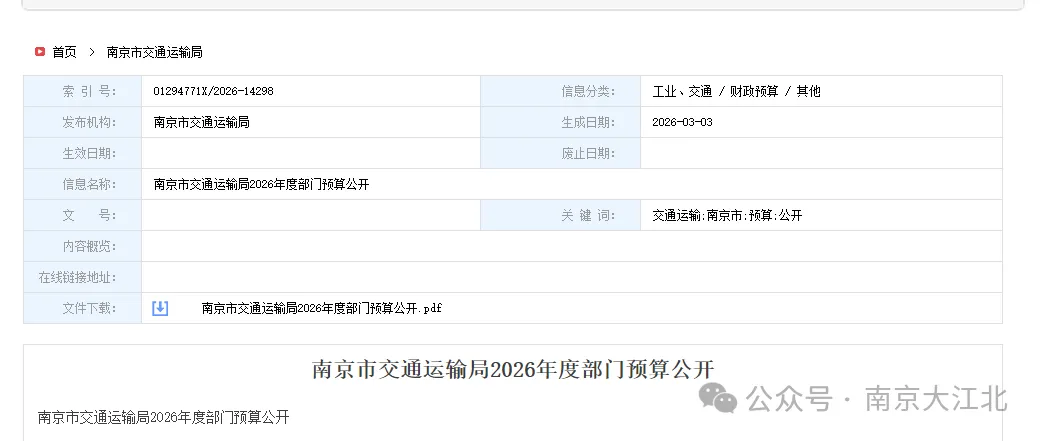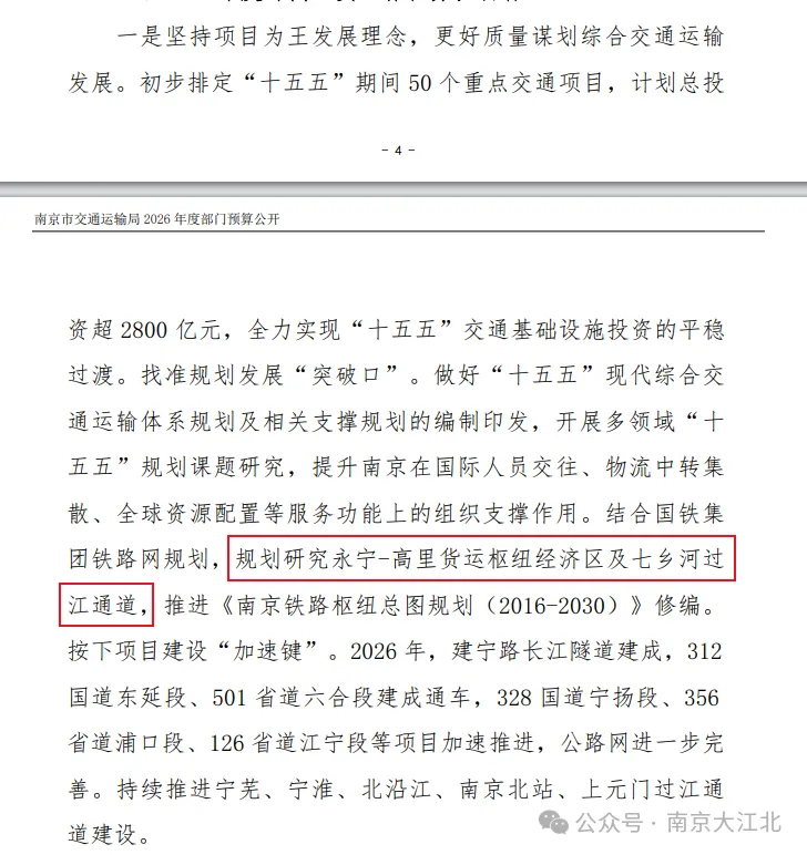 3月3日,2026年度南京市交通运输局部门预算公开,在2026年度部门主要工作任务及目标中提到:结合国铁集团铁路网规划,规划研究永宁-高里货运枢纽经济区及七乡河过江通道,推进《南京铁路枢纽总图规划(2016-2030)》修编。