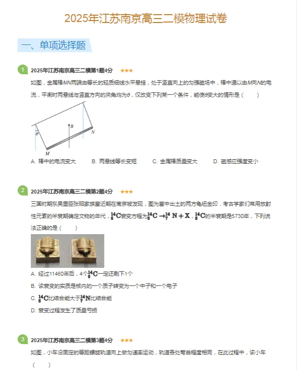 2012-2025学年南京各区高三二模物理真题及答案解析