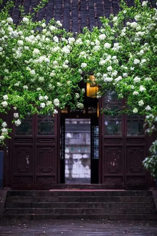 清凉山的木绣球开在崇正书院内,古典气息赋予了木绣球灵动的属性。门扉树影,窗开看花,韶韶年华,有一种访古通幽之意境。